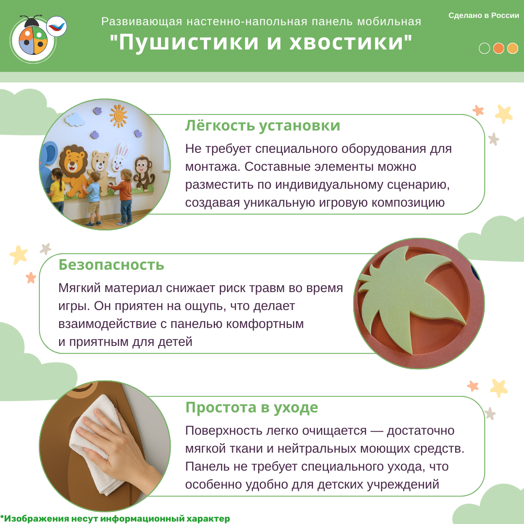 Приобретая развивающую настенно-напольную панель мобильную "Пушистики и хвостики" , комплект (ЖУ-ЖУ-НП9700), вы получаете: