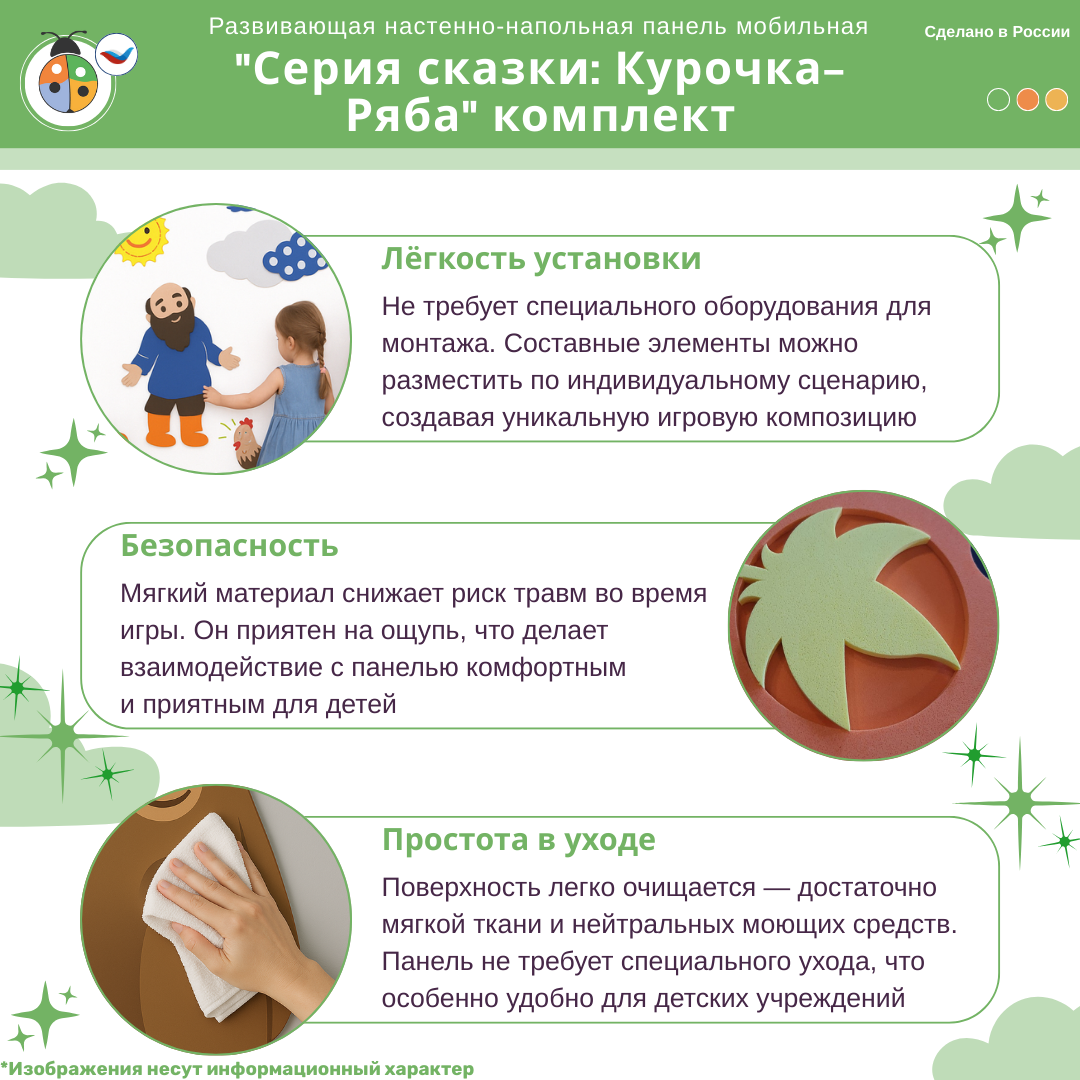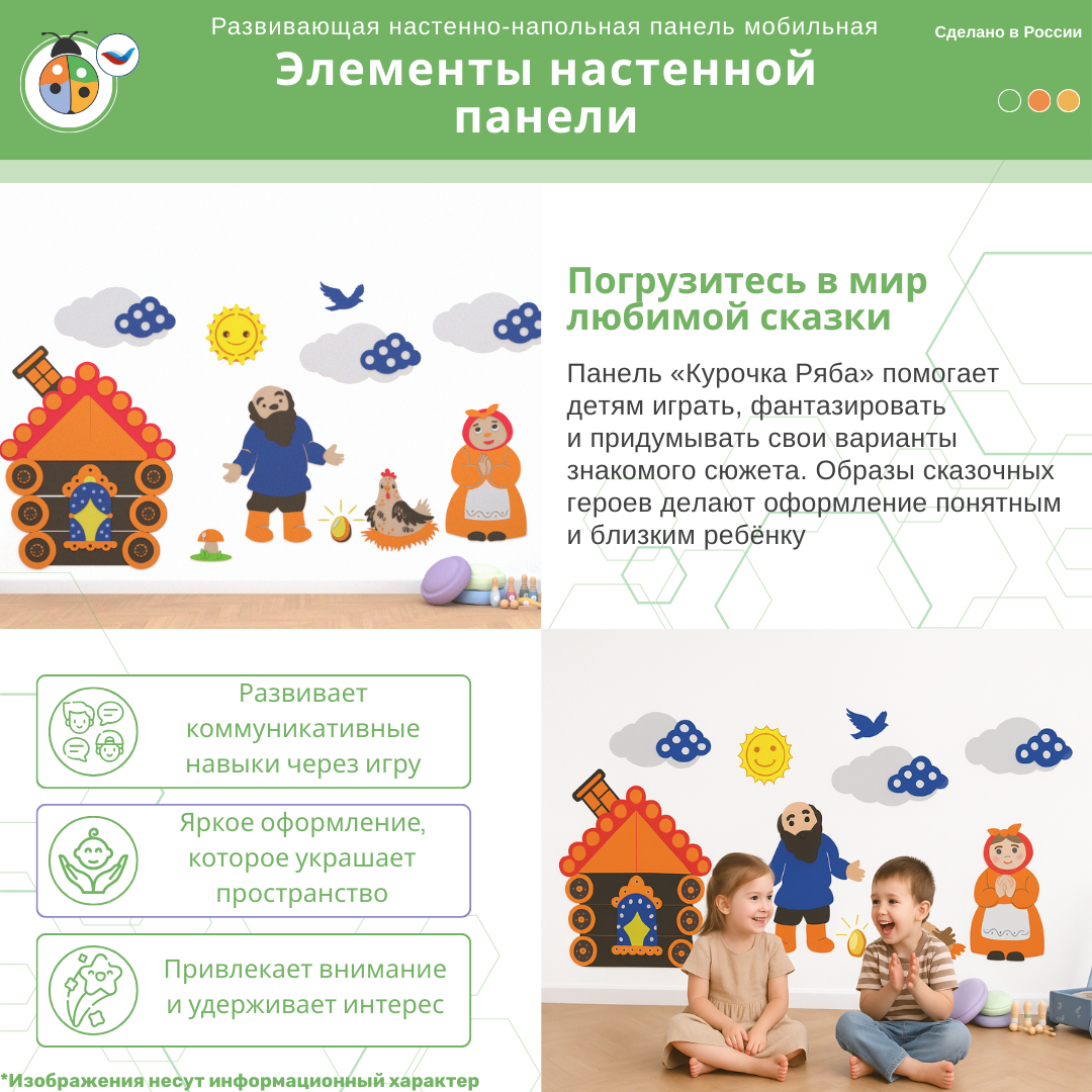 Приобретая развивающую настенно-напольную панель мобильную "Курочка Ряба" , комплект (ЖУ-ЖУ-НП6400), вы получаете: