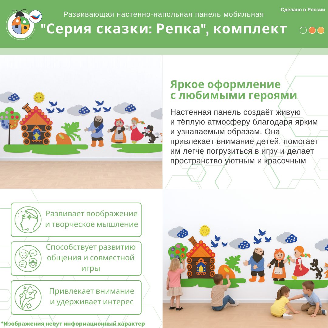 Приобретая развивающую настенно-напольную панель мобильную "Серия сказки: Репка", комплект (ЖУ-ЖУ-НП1100), вы получаете: