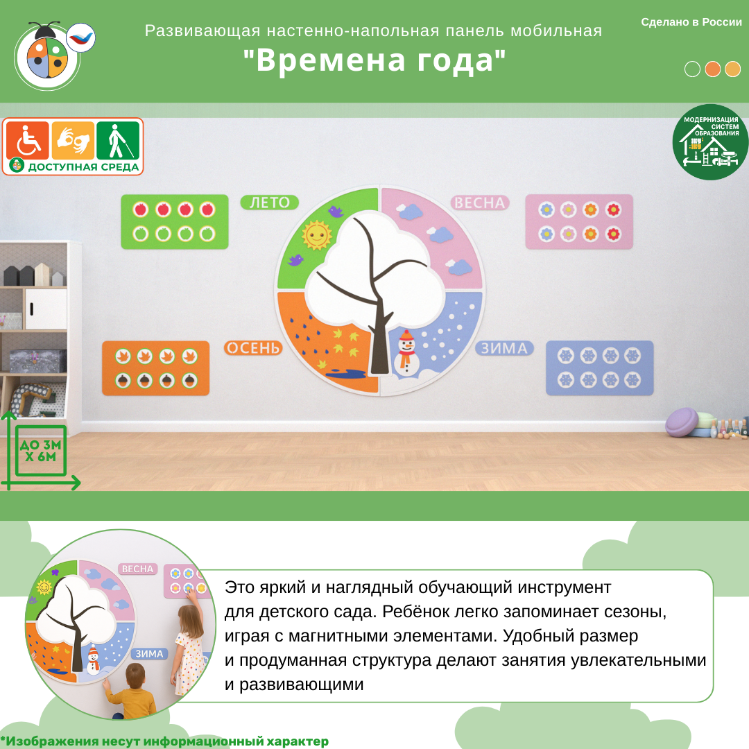 Интерактивная настенно-напольная панель «Времена года» с металлической поверхностью и тематическими магнитами в игровой форме знакомит детей с сезонными изменениями природы, развивая мелкую моторику и познавательный интерес!