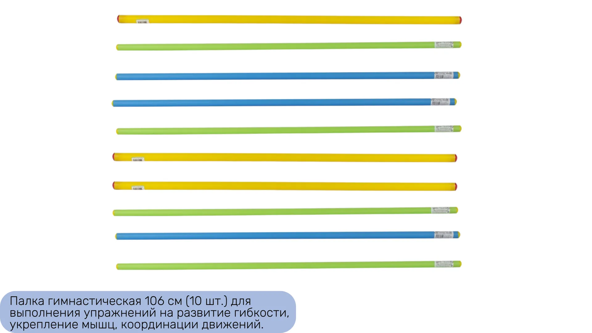 11. Палка гимнастическая 106 см (10 шт.) - предназначена для выполнения упражнений на развитие гибкости, укрепление мышц, координации движений. Может быть использована при эстафетах, конкурсах как препятствие.