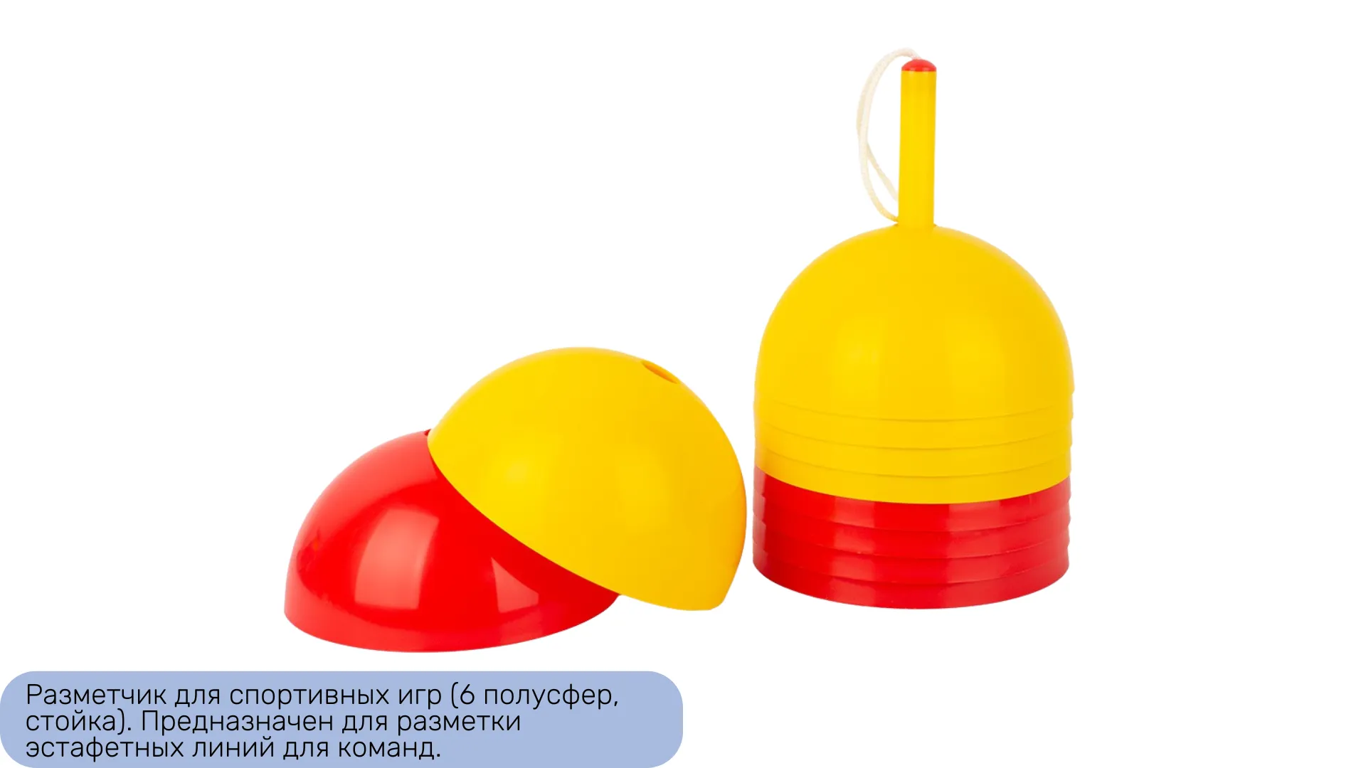 15. Разметчик для спортивных игр (1 шт.) - предназначен для разметки эстафетных линий для команд. Представляет сбой 6 полусфер, надетых на стойку. Для каждой команды свой цвет.