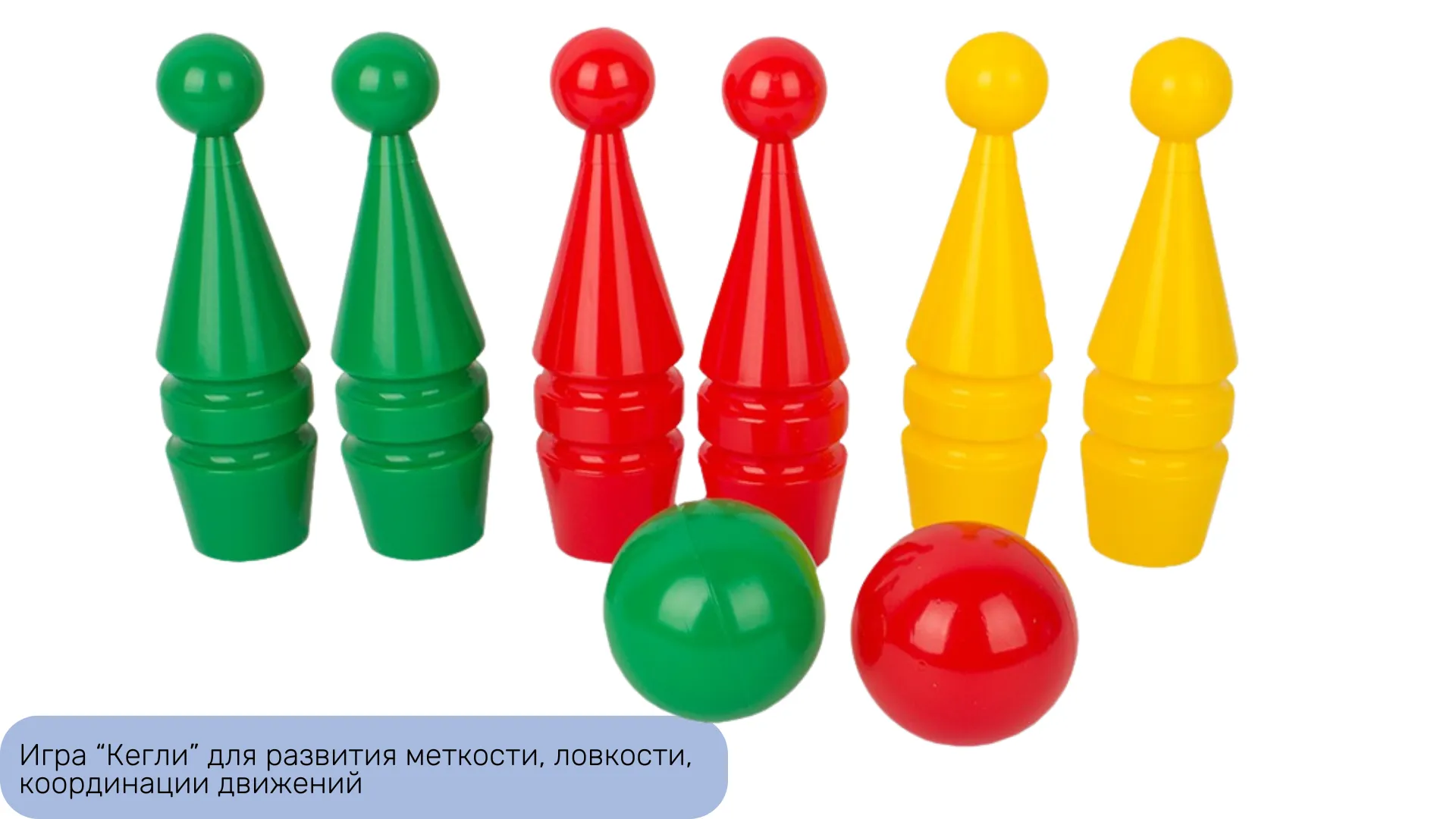 2. Игра "Кегли" (1 шт.) - имитация игры в боулинг, цель игры заключается в сбивании кегля шариком. Игра развивает меткость, ловкость, координацию движений. Состоит из кеглей и шаров.