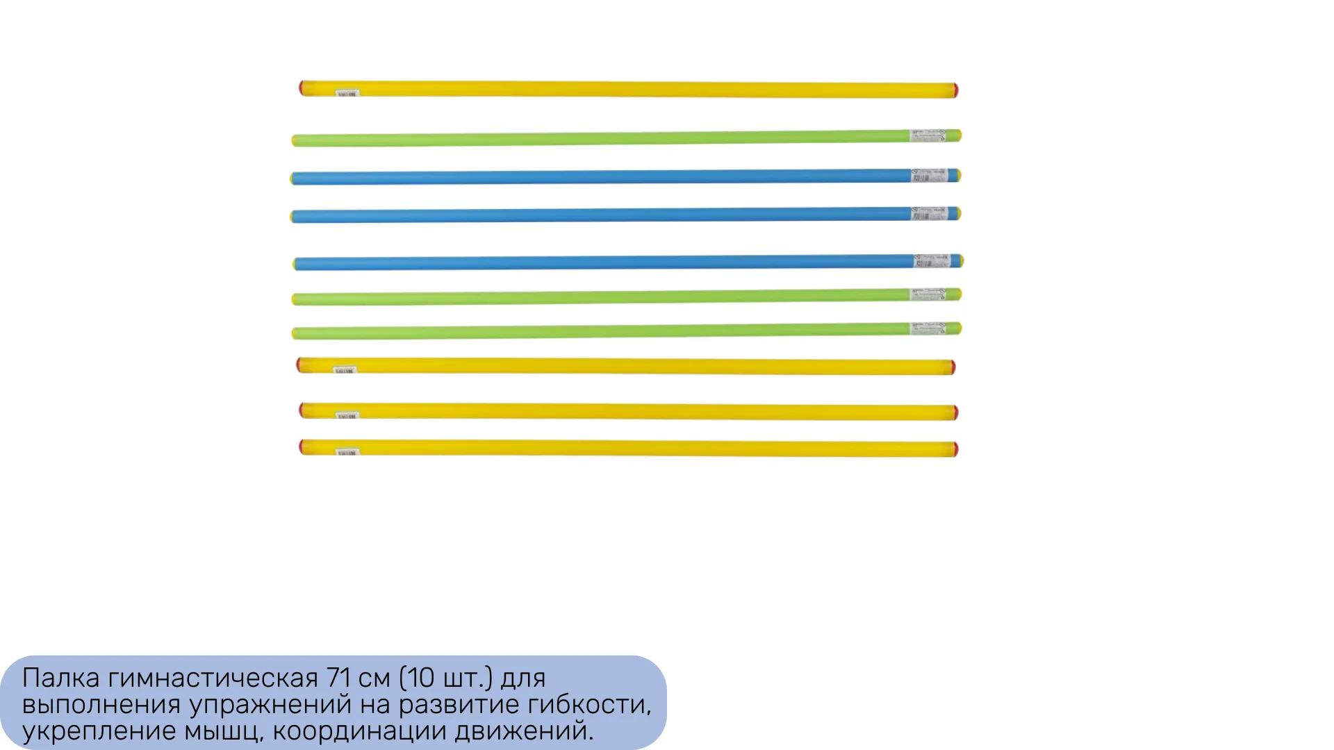 12. Палка гимнастическая 71 см (10 шт.) - предназначена для выполнения упражнений на развитие гибкости, укрепление мышц, координации движений. Может быть использована при эстафетах, конкурсах как препятствие.