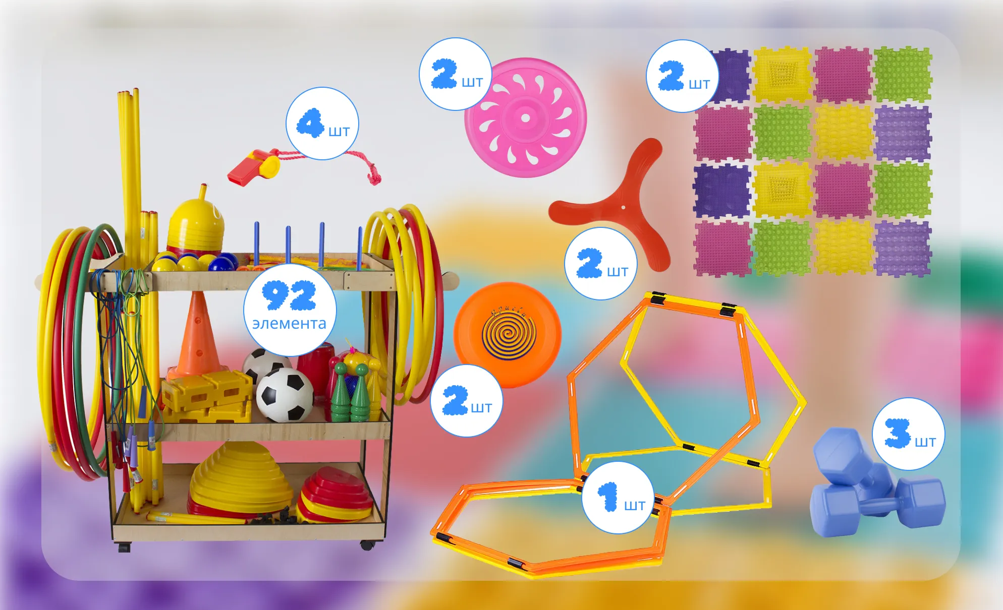Спортивный комплекс из 111 предметов подходит для занятий на улице и в помещении. Разнообразное наполнение комплекса позволяет выполнять различные упражнения и эстафеты.
