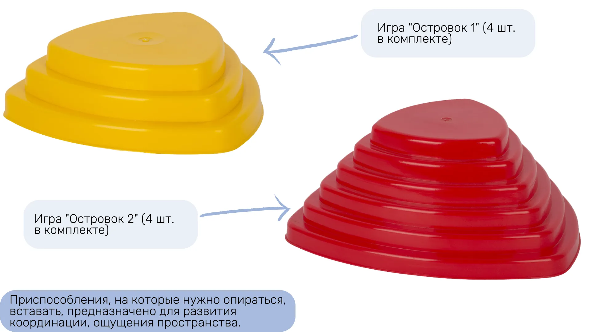 4. Игра "Островок 1" (4 шт.) - приспособление, на которое нужно опираться, вставать, предназначено для развития координации, ощущения пространства. Игра может использоваться для разметки в ходе эстафет. Состоит из 3-х ступенек.