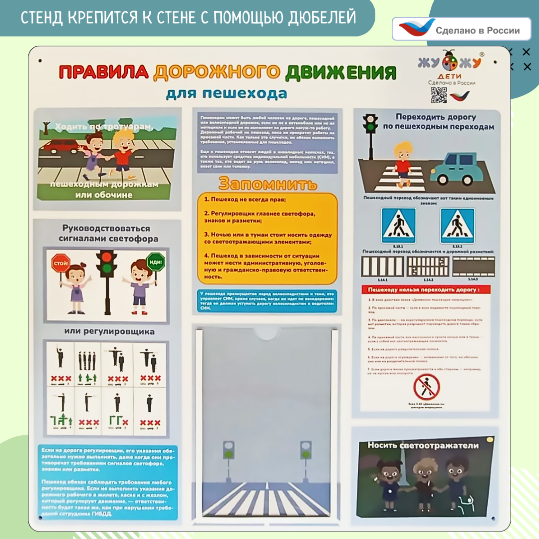 Обучающий стенд предназначен для размещения на стене. Стенд предназначен для ознакомления детей с основными правилами поведения на дороге для пешеходов, правилами пользования светофором и пешеходным переходом и многое другое. На стенде представлены наглядные рисунки с обозначениями.