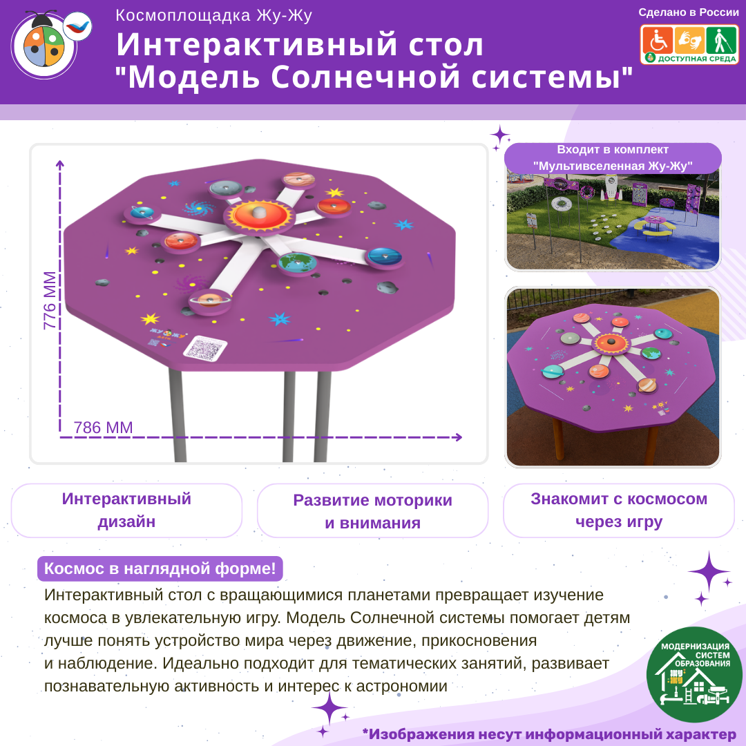 Космоплощадка Жу-Жу: интерактивный стол "Модель Солнечной системы" превращает изучение астрономии в увлекательную игру! На столешнице — подвижная модель Солнечной системы: яркое Солнце и вращающиеся вокруг него планеты на своих орбитах.