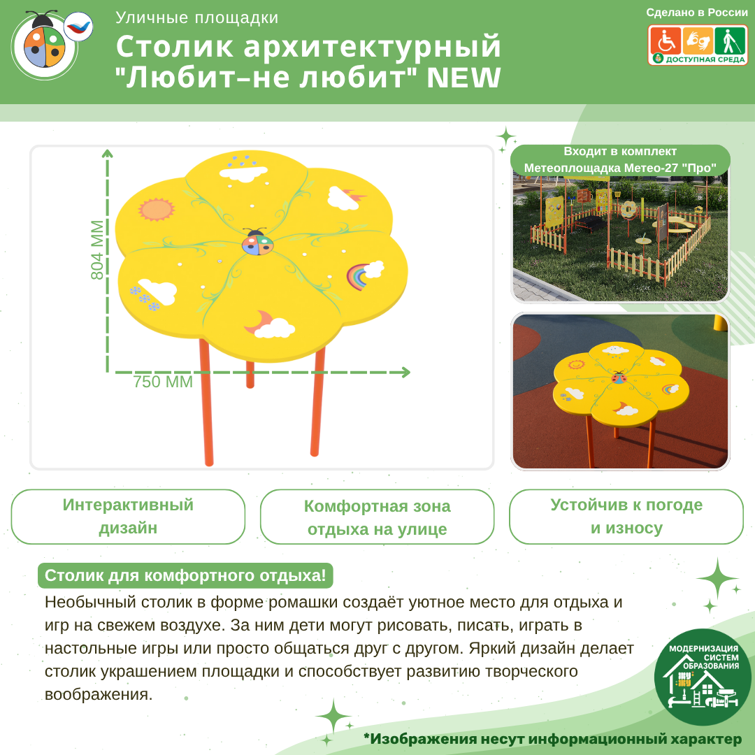 Удобный и необычный столик в форме ромашки украсит любую площадку и создаст зону отдыха для детей. На столике удобно вести записи, рисовать и играть в настольные игры. Столик выполнен из влагостойкой фанеры, поэтому ему не страшны любые погодные условия!