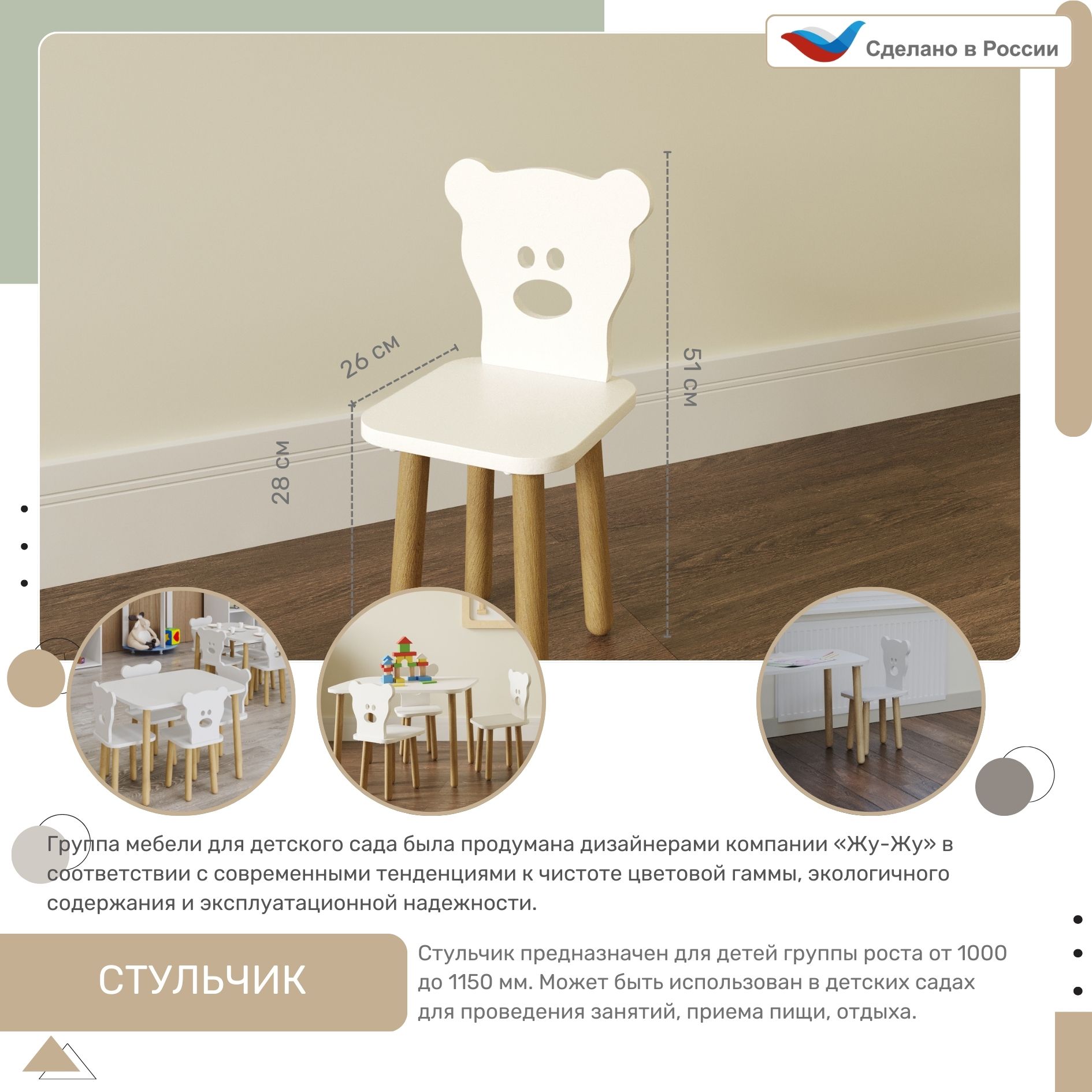 - Высота стула оптимальная для детей группы роста от 1000 до 1150 мм.