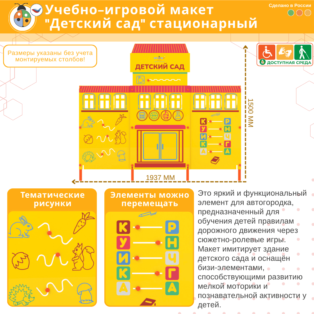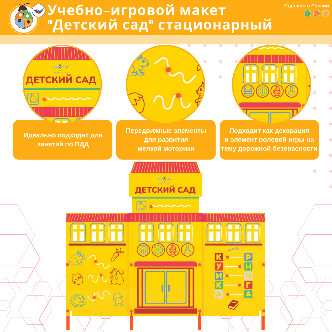 Стационарный макет детского сада дополняет комплект автогородка, позволяет создавать различные дорожные ситуации! На макете расположены бизи-элементы, которые ребенок может крутить, перемещать, тем самым развивая моторику рук. Макет предназначен как для помещения, так и для улицы.