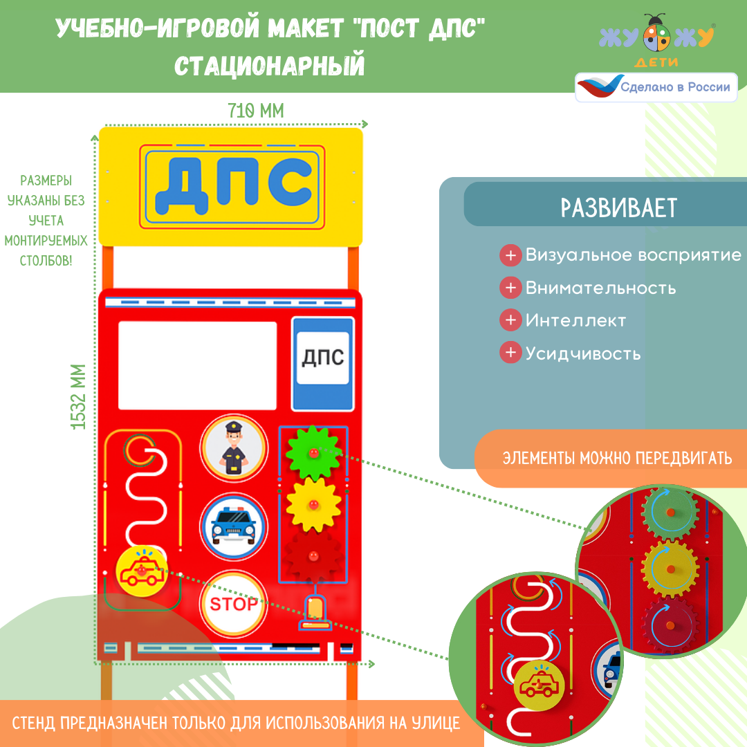 Учебно-игровой макет "Пост ДПС" стационарный дополняет комплект автогородка, позволяет создавать различные дорожные ситуации. На макете расположены различные бизи-элементы, которые ребенок может крутить, перемещать, тем самым развивая моторику рук!