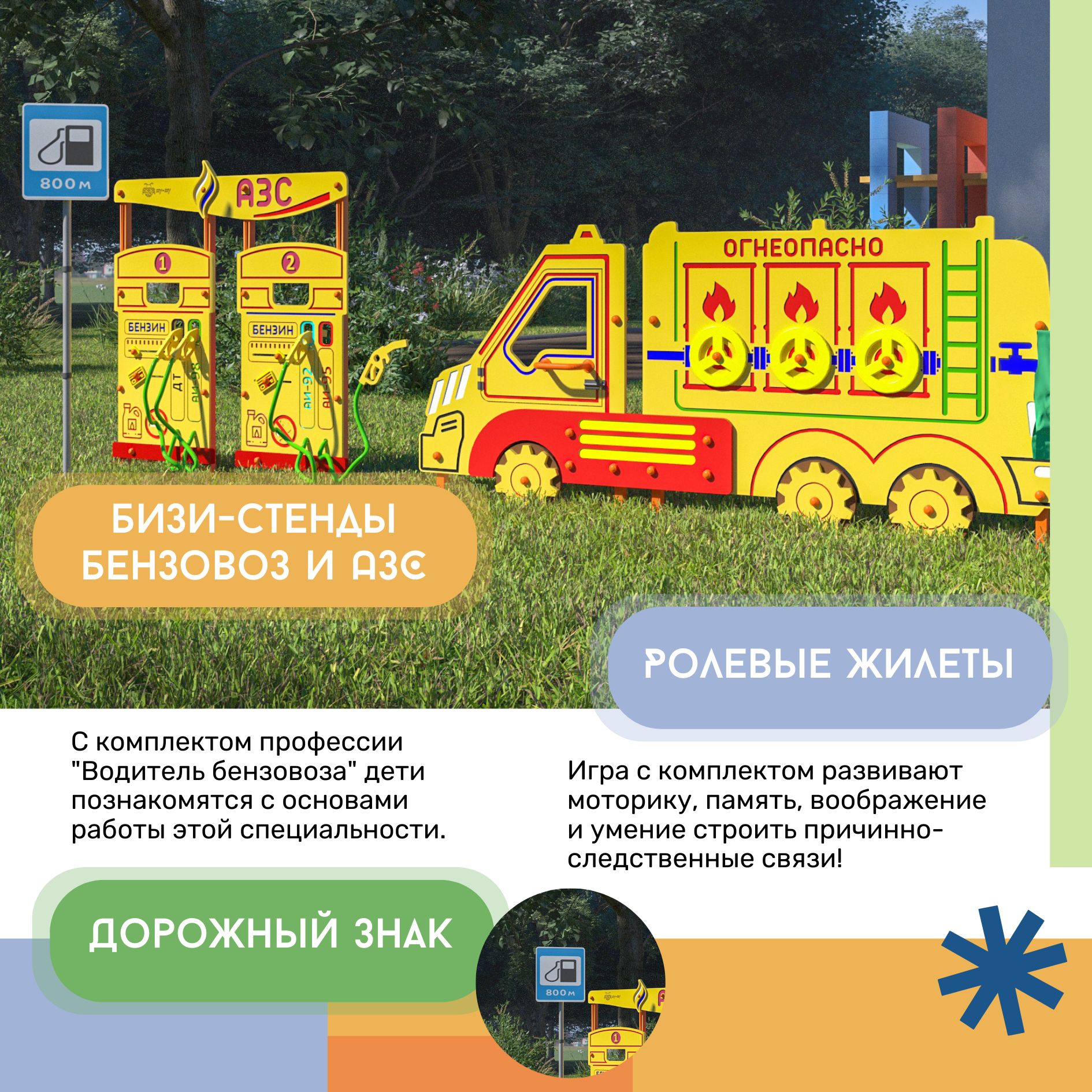 1. Уличный бизиборд "Бензовоз" стационарный - позволяет создавать различные дорожные ситуации. На бизиборде расположены бизи-элементы, которые можно передвигать, крутить, снимать и возвращать обратно!