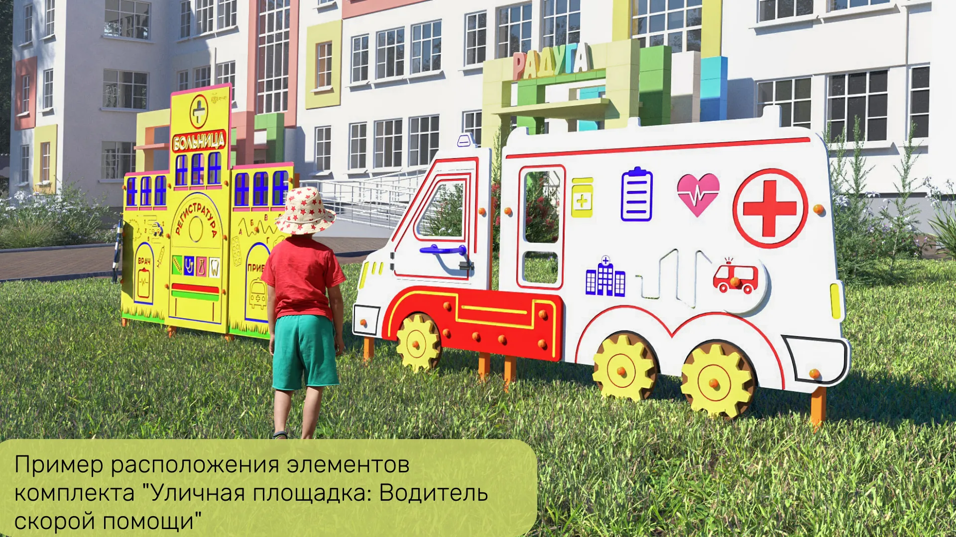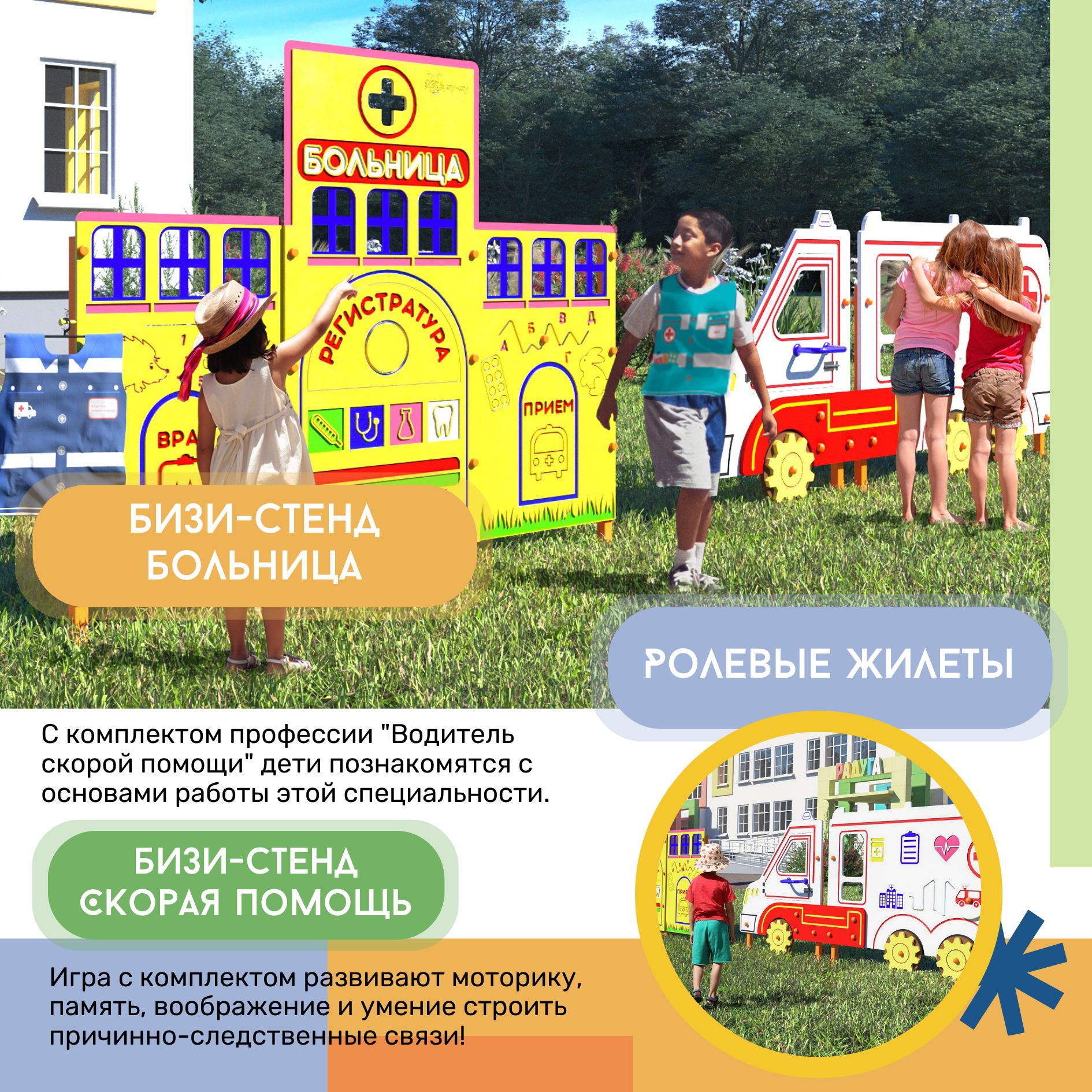1. Уличный бизиборд "Скорая помощь" стационарный - позволяет создавать различные дорожные ситуации. На бизиборде расположены бизи-элементы, которые можно передвигать, крутить, снимать и возвращать обратно!