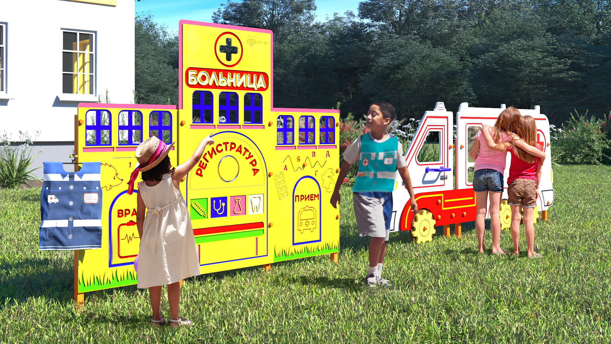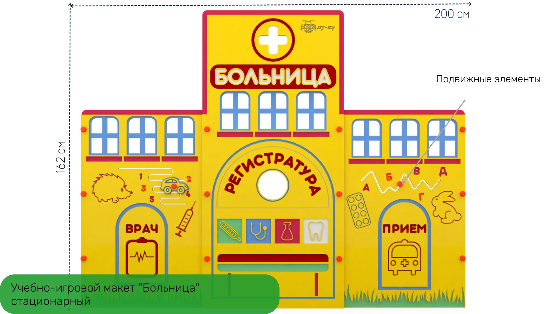 4. Учебно-игровой макет "Больница" стационарный - дополняет комплект автогородка, позволяет создавать различные дорожные ситуации! На макете расположены бизи-элементы, которые ребенок может крутить, перемещать, тем самым развивая моторику рук! Монтаж простой и не требует специальных навыков.