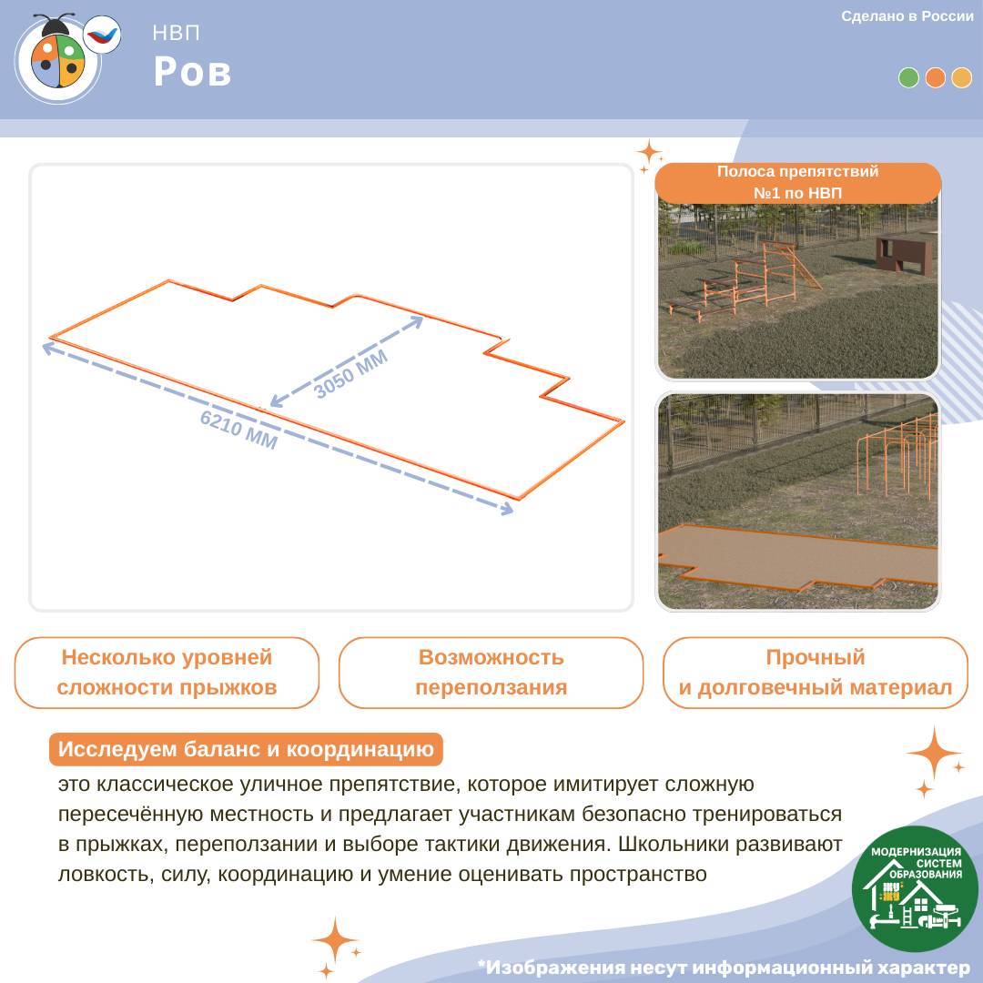 Препятствие "Ров" (Длина х Ширина): 6210х3050 мм. Высота столбиков-креплений: 353 мм. Вес: 30 кг.