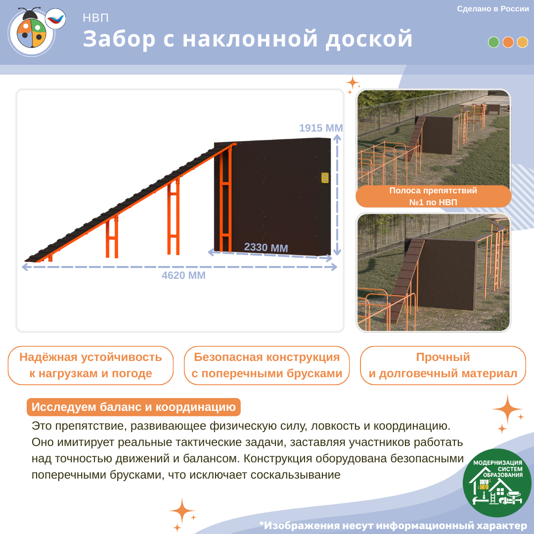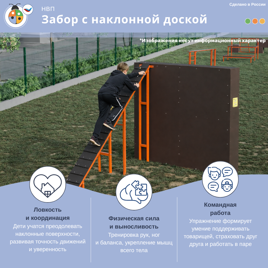 Уличное препятствие для НВП и ОБЖ: "Забор с наклонной доской" — препятствие, задача которого состоит в том, чтобы с разбега забраться по лестнице, сохраняя равновесие, спрыгнуть с забора, используя его верхнюю часть для опоры.
