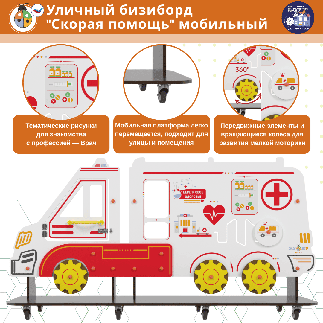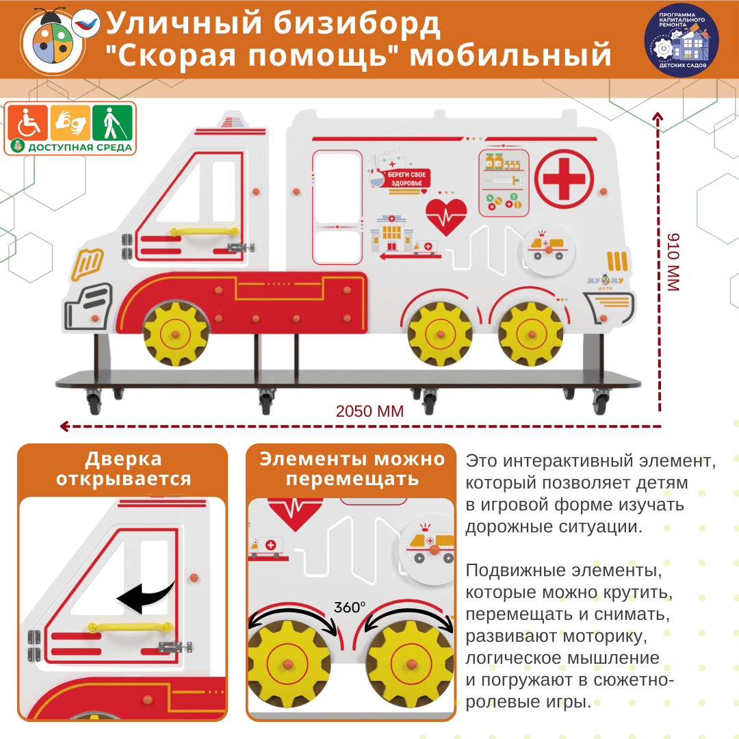 Уличный бизи-борд "Скорая помощь" мобильный позволяет создавать различные дорожные ситуации. На бизиборде расположены бизи-элементы, которые можно передвигать, крутить, снимать и возвращать обратно!