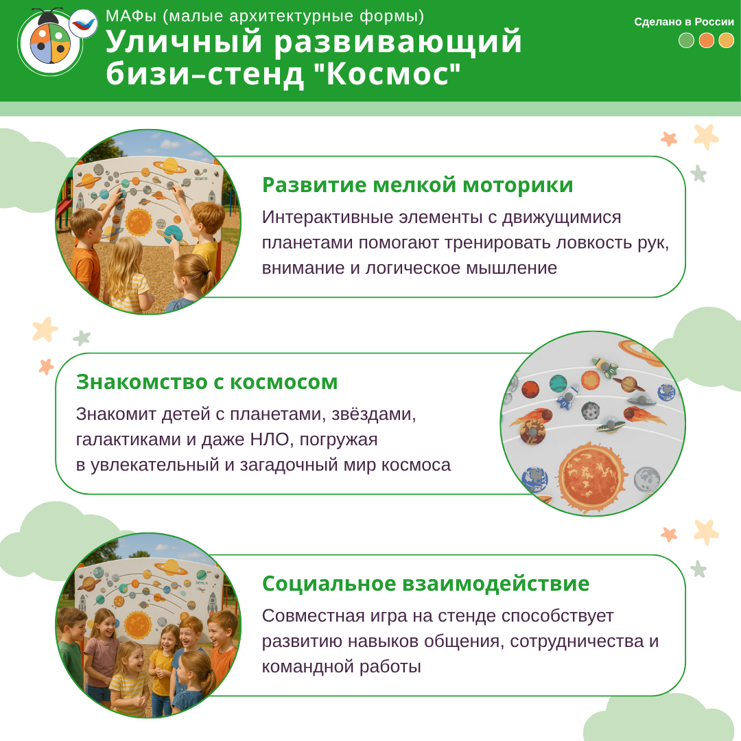 Уличный развивающий бизи-стенд "Космос", Жу-Жу — это увлекательный и образовательный инструмент, который помогает детям изучать планеты и космические тела Солнечной системы.