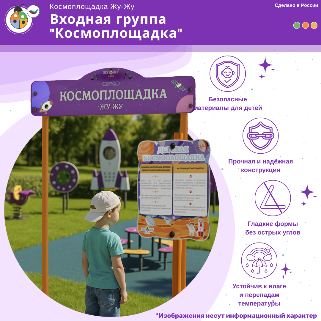 "Входная группа «Космоплощадка»" – стильное тематическое оформление входа в космическом стиле: фиолетовая табличка с выразительной надписью на двух прочных опорах, украшенных изображениями планет. Идеальное решение для детских садов, школ и игровых зон, которое создает атмосферу космического приключения с первых секунд и отличается устойчивостью к любым погодным условиям.