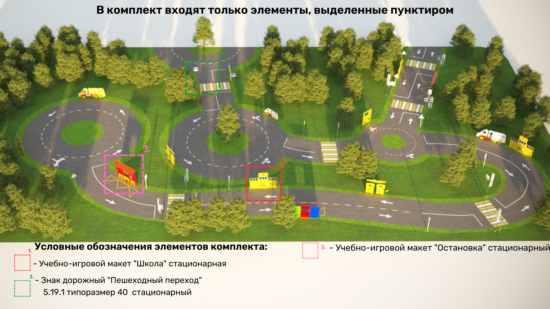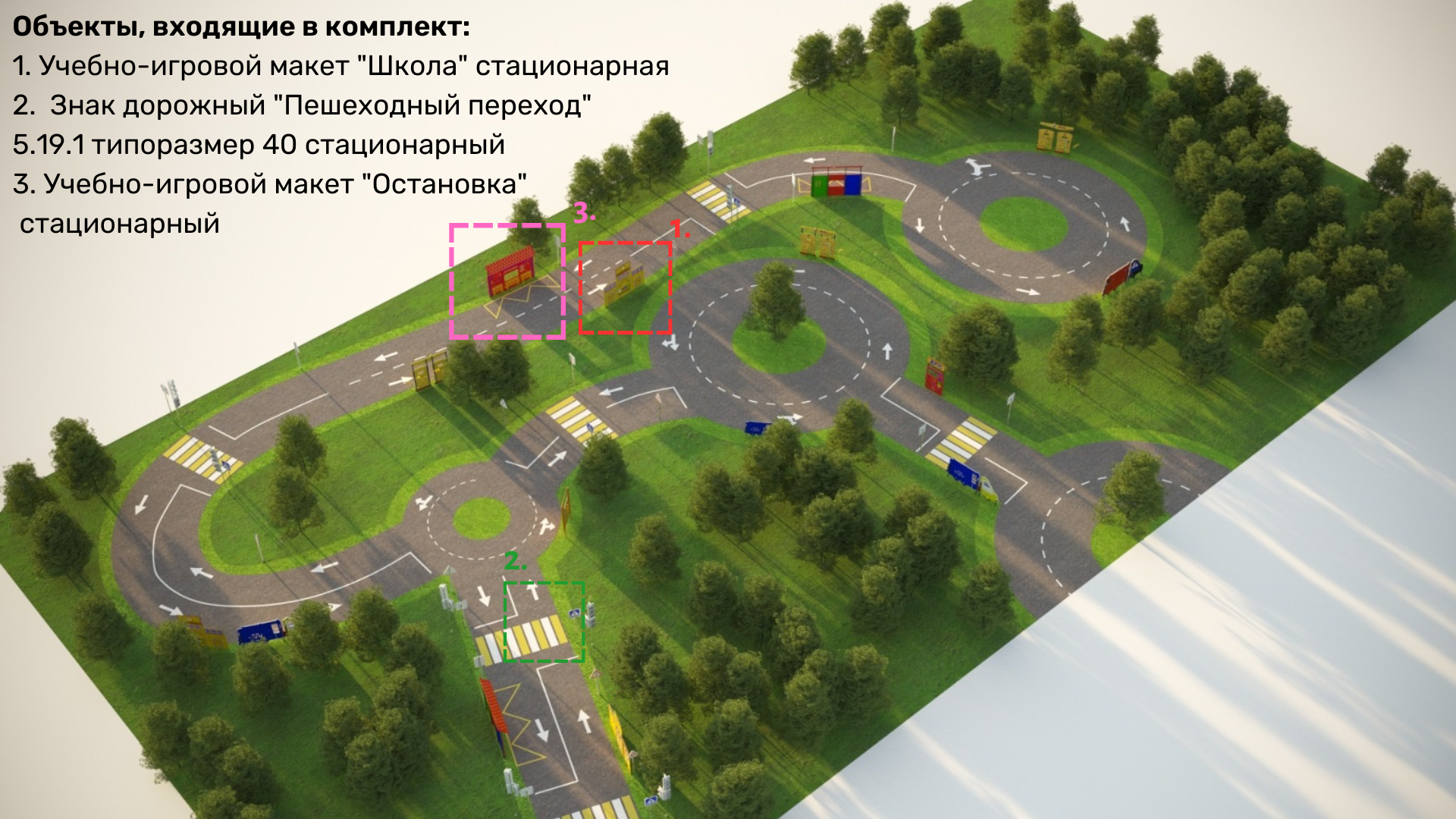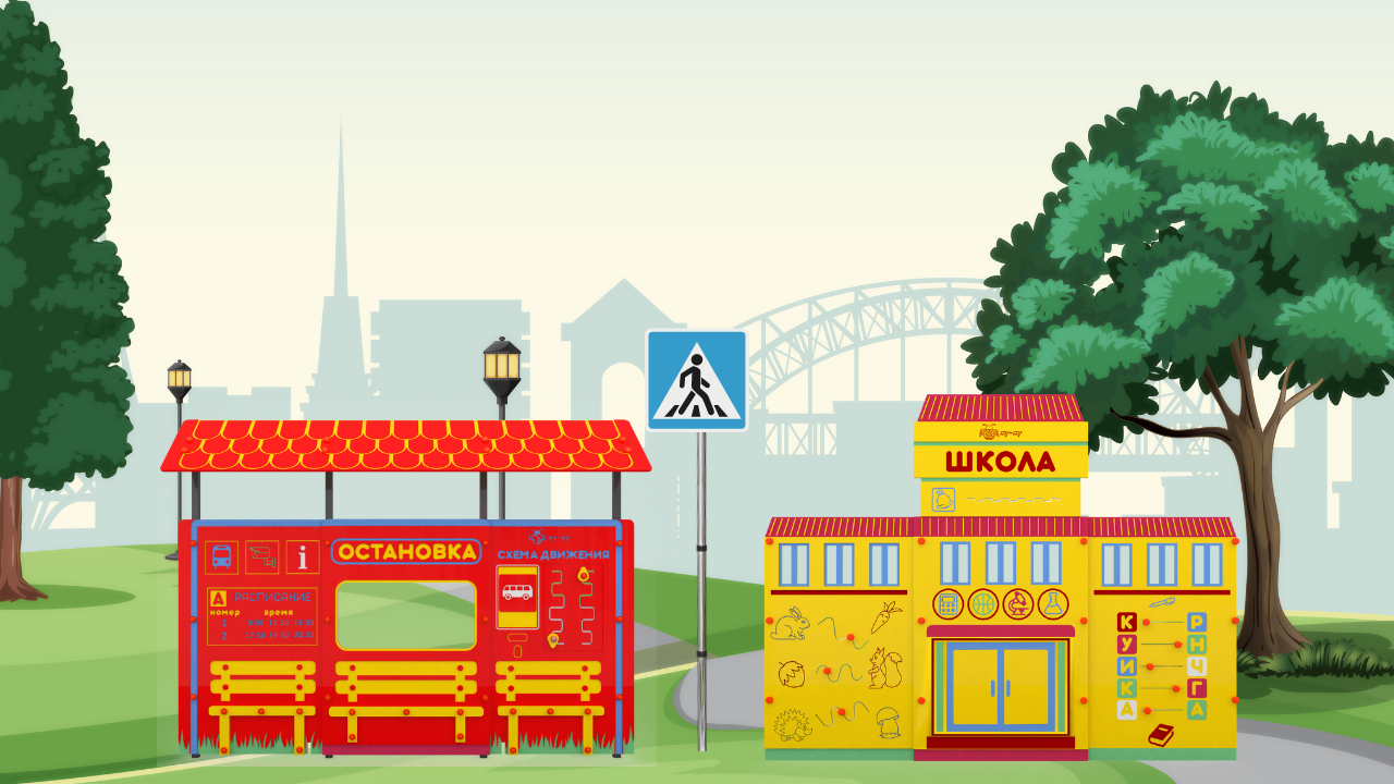 Установите уникальную площадку по тематике ПДД! В неё входит: стационарный макет школы, остановки и дорожные знаки. На площадке получится создать дорожные ситуации для водителей.