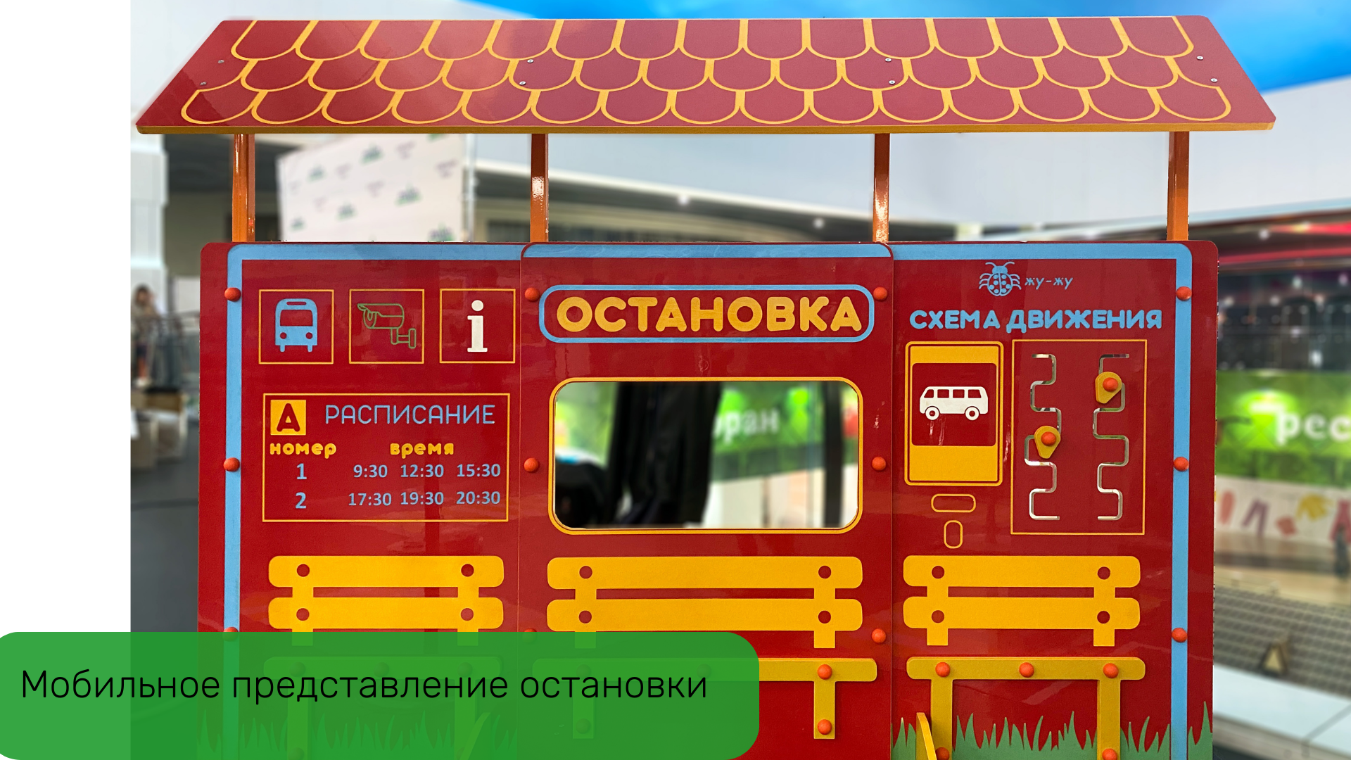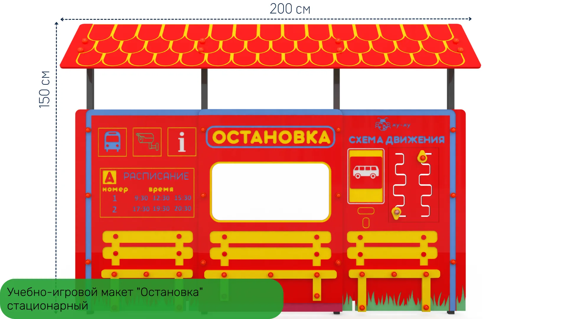 2. Учебно-игровой макет "Остановка" стационарный - дополняет комплект автогородка, позволяет создавать различные дорожные ситуации. На макете расположены бизи-элементы, которые ребенок может крутить, перемещать, тем самым развивая моторику рук.