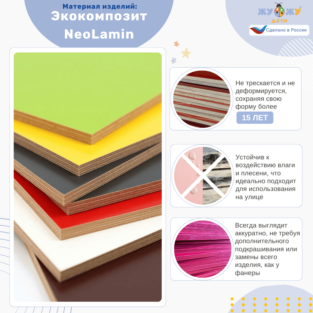 Материалы: влагостойкая фанера ФСФ 15 мм, ламинированная цветным пластиком, металл.