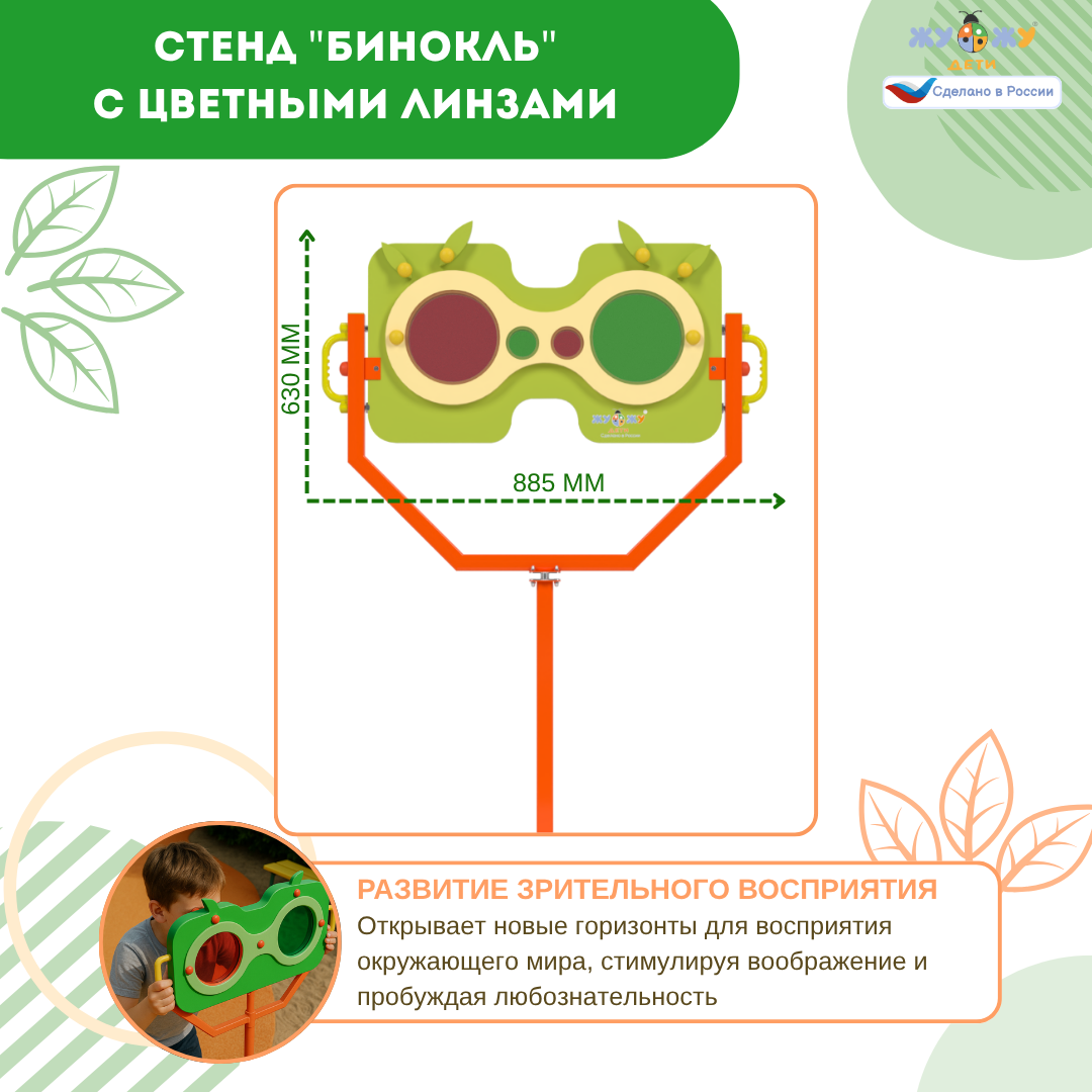 Экоплощадка Жу-Жу: стенд "Бинокль" с цветными линзами — это отличный инструмент для маленьких исследователей, который позволяет им изучать окружающий мир и развивать интерес к природе и наблюдениям. Такой бинокль специально разработан с учетом безопасности и удобства для детей.