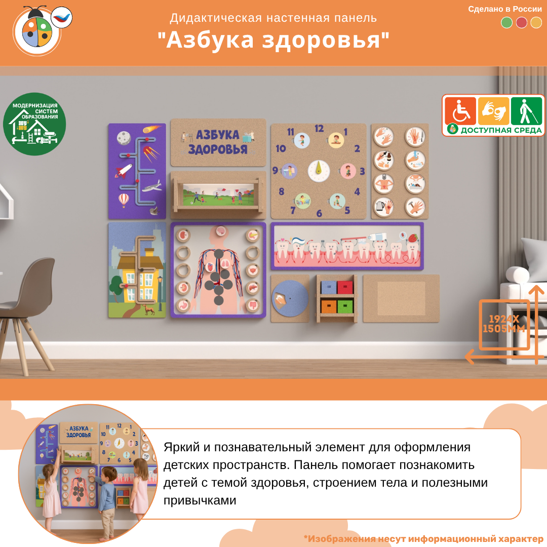Яркий и познавательный элемент для оформления детских пространств. Панель помогает детям в игровой форме познакомиться с темой здоровья, строением тела и правилами гигиены.