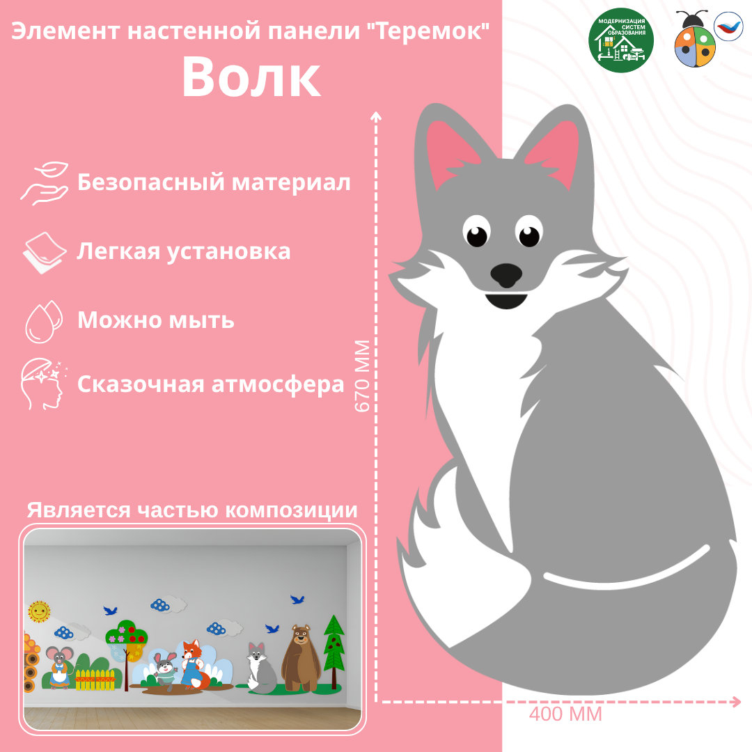 Элемент настенной панели "Волк", выполненный из мягкого пластика, представляет собой детализированную фигурку волка, идеально подходящую для проведения занятий по тематике русских сказок. Волк изображен в сидячей позе, с добрым и внимательным взглядом, направленным прямо вперед. Элемент помогает детям визуализировать персонажей, стимулирует их воображение и способствует лучшему пониманию и запоминанию сюжетов сказок.
