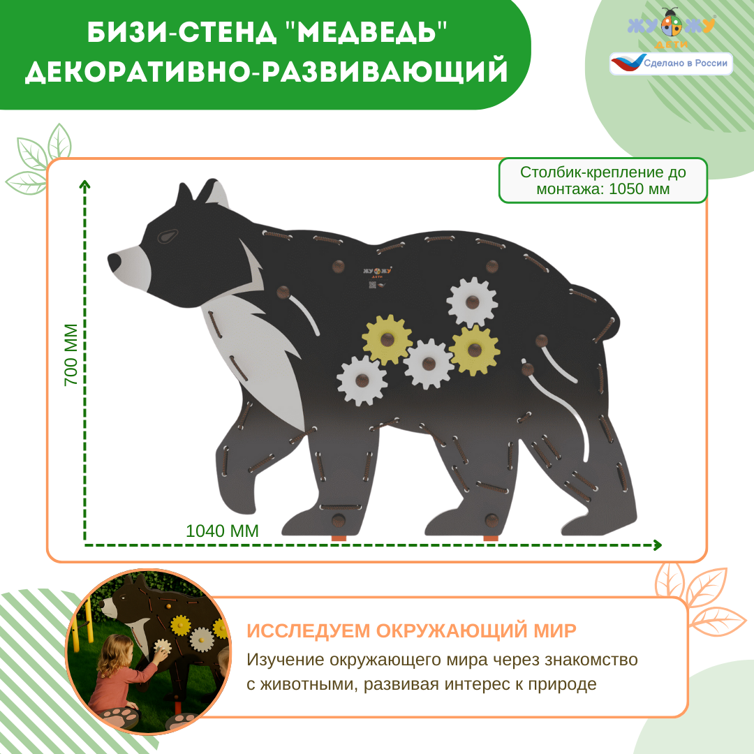 Добрый Мишка охраняет площадку, а детям с ним точно не будет скучно! Этот стенд разработан с учетом педагогических принципов и способствует развитию мышления, коммуникативных и творческих навыков у детей. На стенде расположены 5 бизи-шестеренок и шнур. Он предоставляет детям возможность свободного творчества и создания различных узоров. Кроме того, дети могут изучать техники плетения и развивать навыки работы в команде.