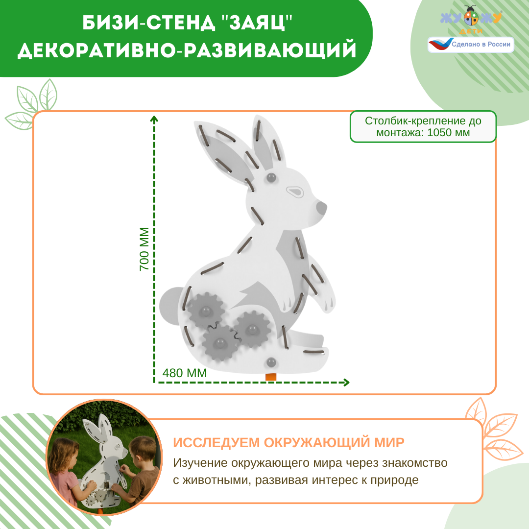 Заяц - один из самых популярных персонажей русских народных сказок. Играя на площадке, вспомните сюжеты сказок, в которых встречаются животные на площадке - Медведь, Заяц и Лиса. В каких сказках они встречаются все вместе, а в каких - по отдельности? Особенность развивающих стендов "Животные" заключается в их тактильности, которая способствует развитию моторики рук и сенсорных навыков у детей. Они помогут детям не только развлечься, но и активно учиться, осваивая новые навыки и развивая творческое мышление!.