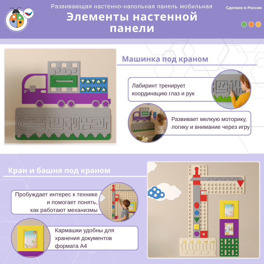 Приобретая развивающую настенно-напольную панель мобильная "Инженерия и логика" миди, комплект, вы получаете: