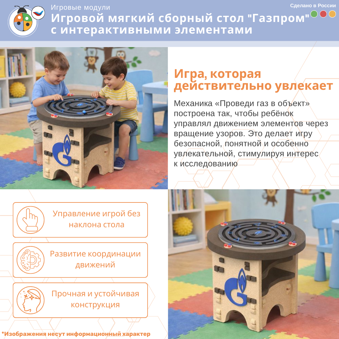 Интерактивный игровой стол 'Газпром' из мягкого полимера с магнитной логической игрой "Проведи газ" развивает у детей пространственное мышление и логику, предлагая увлекательное изучение основ коммунального хозяйства в безопасном игровом формате.
