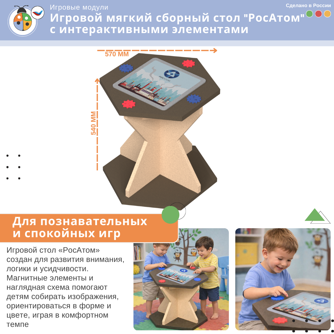 Интерактивный игровой стол "РосАтом" из мягкого полимера развивает логическое мышление и интерес к науке, обеспечивая безопасность и комфорт во время обучения.