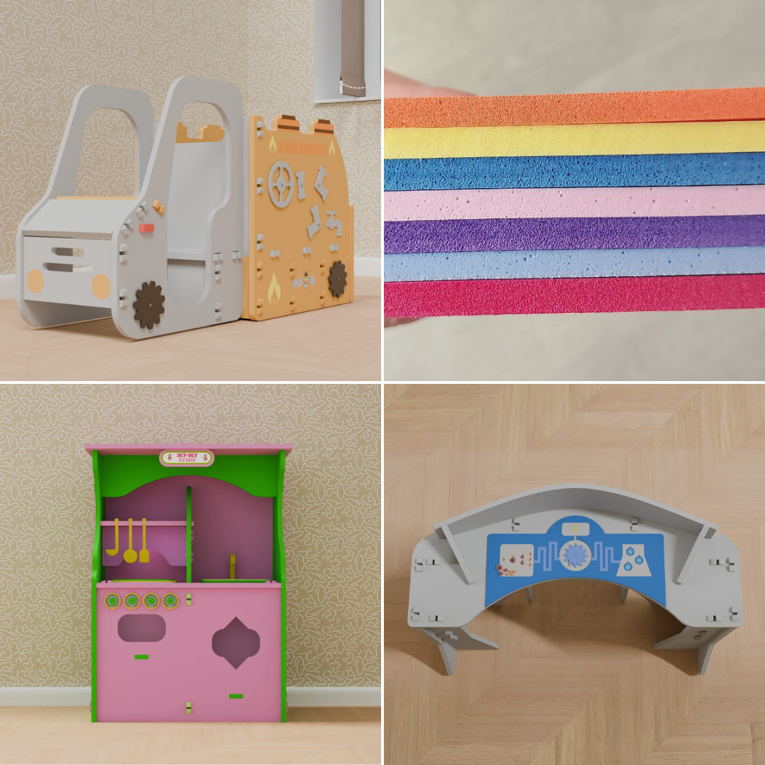 Модульная и безопасная мебель для детских комнат и игровых пространств. Элементы собираются как конструктор, легко переставляются и стимулируют воображение детей благодаря объёмным декоративным фигурам.