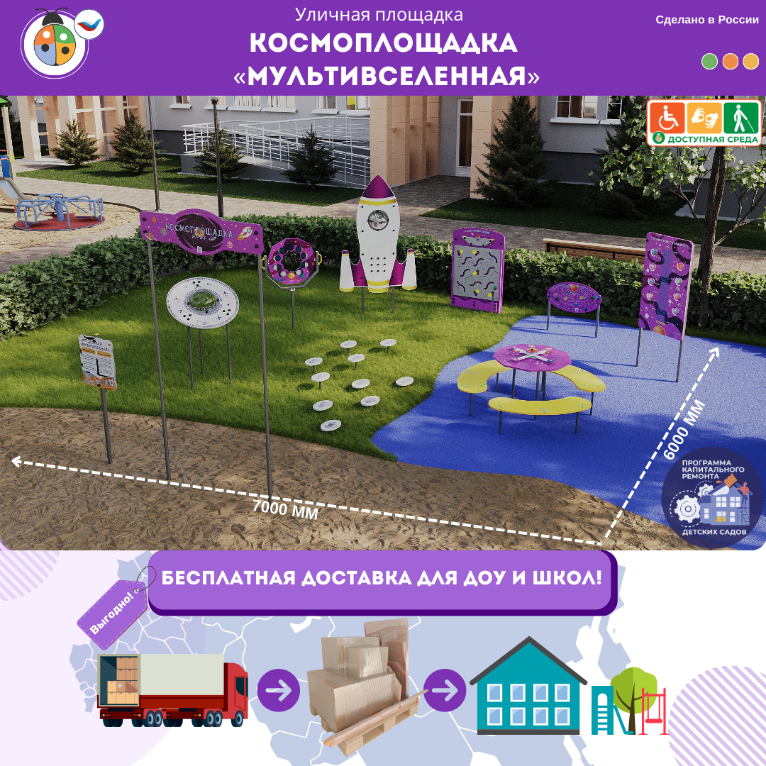 Уличные площадки (метеостанции, музыкальные, патриотические площадки) мы доставляем бесплатно при сумме договора от 150 000 рублей до адреса Покупателя по всей РФ. Остальные индивидуальные комплекты доставляем за счет Покупателя, включая в стоимость договора.