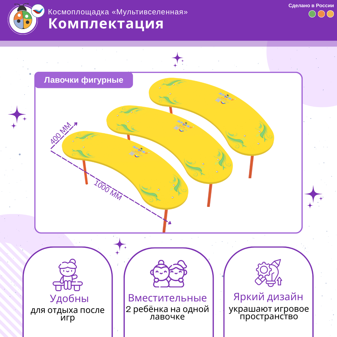 11. Лавочки фигурные 3 шт - предназначены для отдыха от подвижных игр. Выполнены в форме лепестков и отлично сочетаются со столиком в форме ромашки "Любит-не любит".