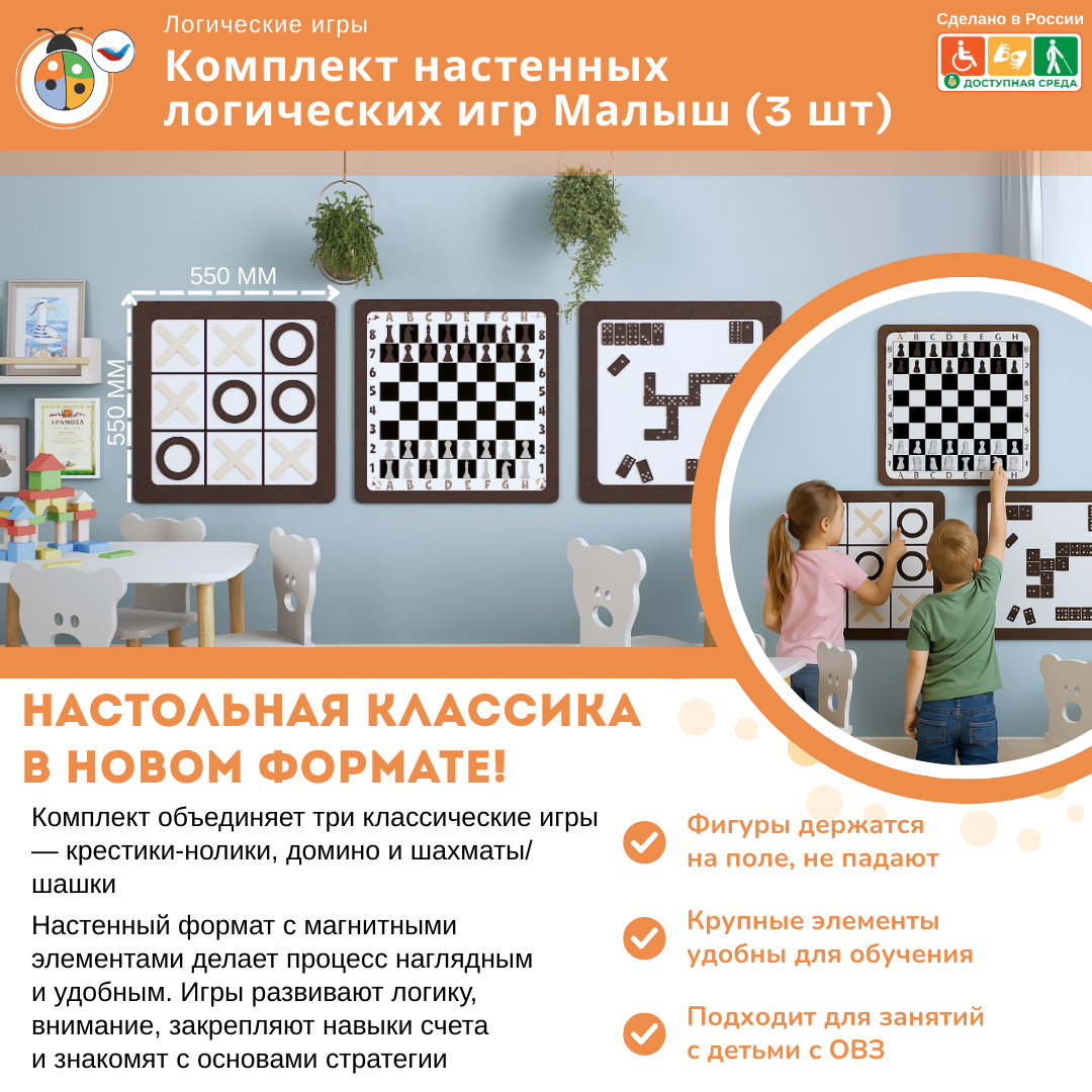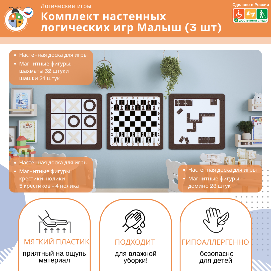 Комплект настенных логических игр Малыш (3 шт) предназначен для детей дошкольного и школьного возраста. Состоит из всеми известных игр: крестики-нолики, домино, шахматы и шашки. Выполнен из экологически чистых материалов и безопасен для детей.
