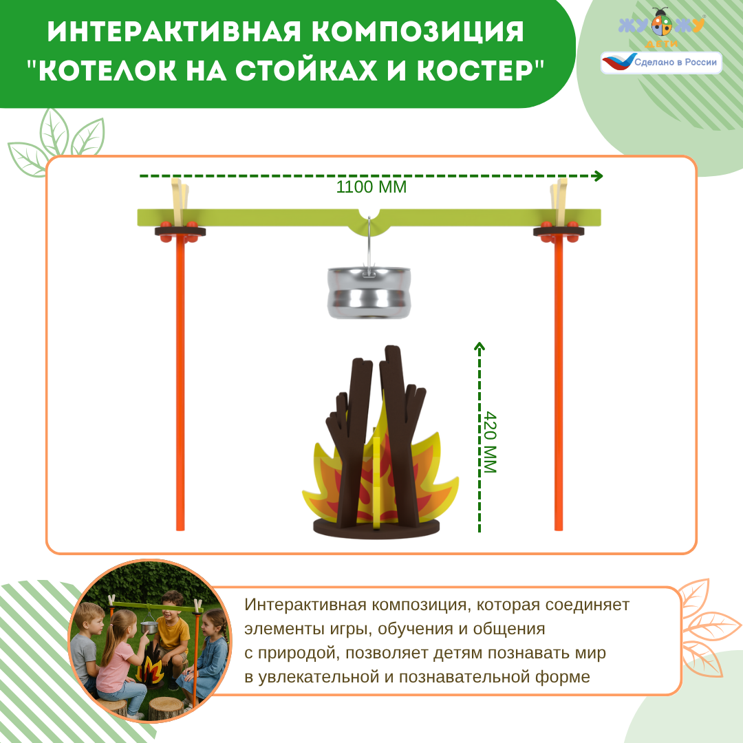 Детский игровой набор, состоящий из котелка на стойках и костра, может стать отличным дополнением для детской площадки или игровой зоны. Такой набор позволяет детям разыгрывать сцены из походной жизни, развивая воображение и навыки ролевой игры.