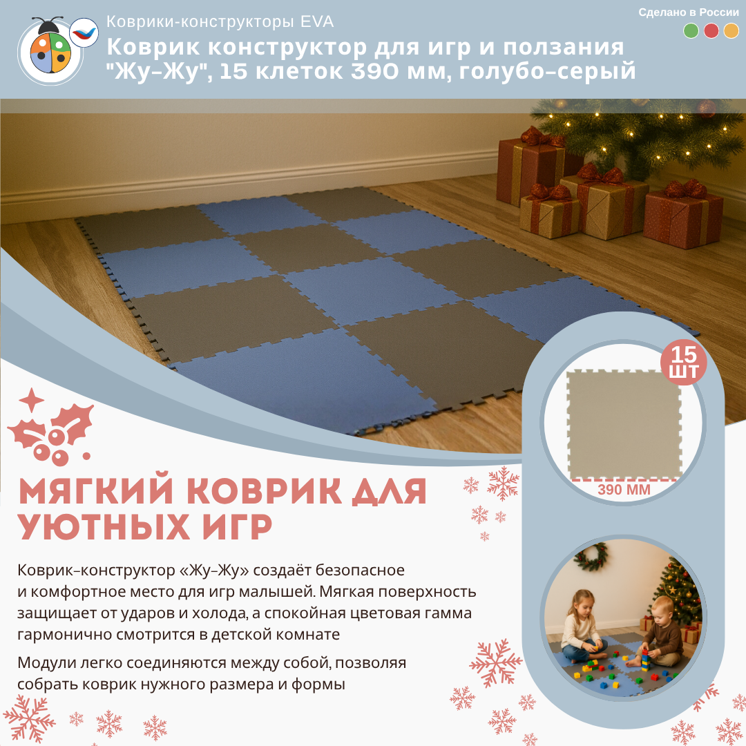 Коврик конструктор для игр и ползания "Жу-Жу", 15 клеток 390 мм, голубо-серый — это отличный выбор для создания безопасной и комфортной игровой зоны для малышей. Такой коврик обеспечивает мягкую поверхность для игр и ползания, а также добавляет стильный акцент в интерьер детской комнаты.