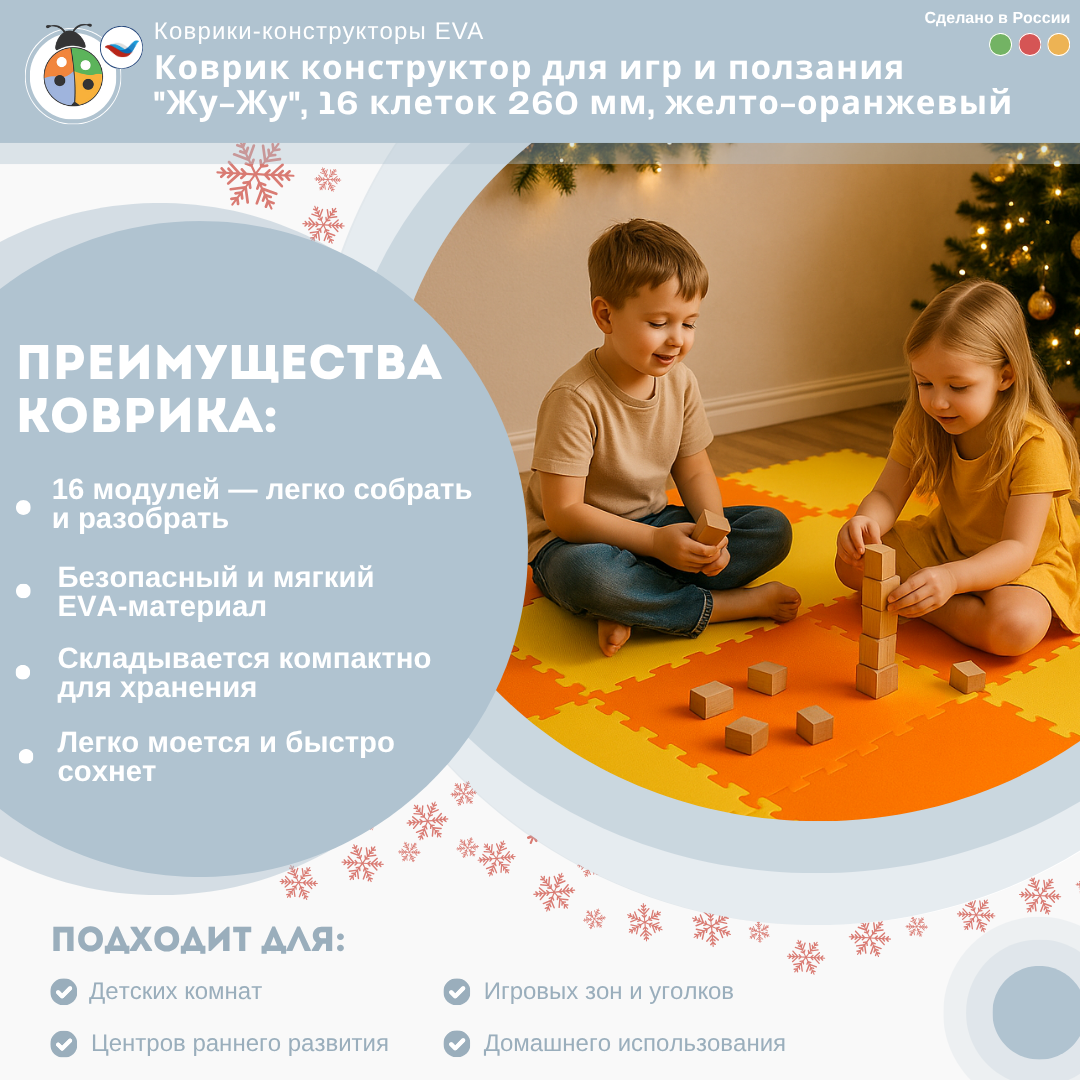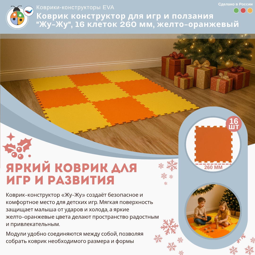 Коврик конструктор для игр и ползания "Жу-Жу", 16 клеток 260 мм, желто-оранжевый — это отличный выбор для создания безопасной и комфортной игровой зоны для малышей. Такой коврик обеспечивает мягкую поверхность для игр и ползания, а также добавляет стильный акцент в интерьер детской комнаты.