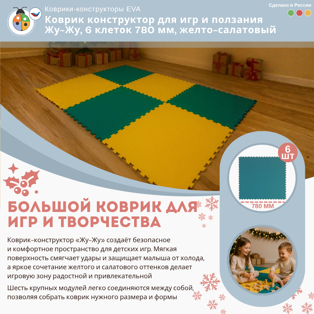 Коврик конструктор для игр и ползания Жу-Жу, 6 клеток 780 мм, желто-салатовый — это отличный выбор для создания безопасной и комфортной игровой зоны для малышей. Такой коврик обеспечивает мягкую поверхность для игр и ползания, а также добавляет стильный акцент в интерьер детской комнаты.