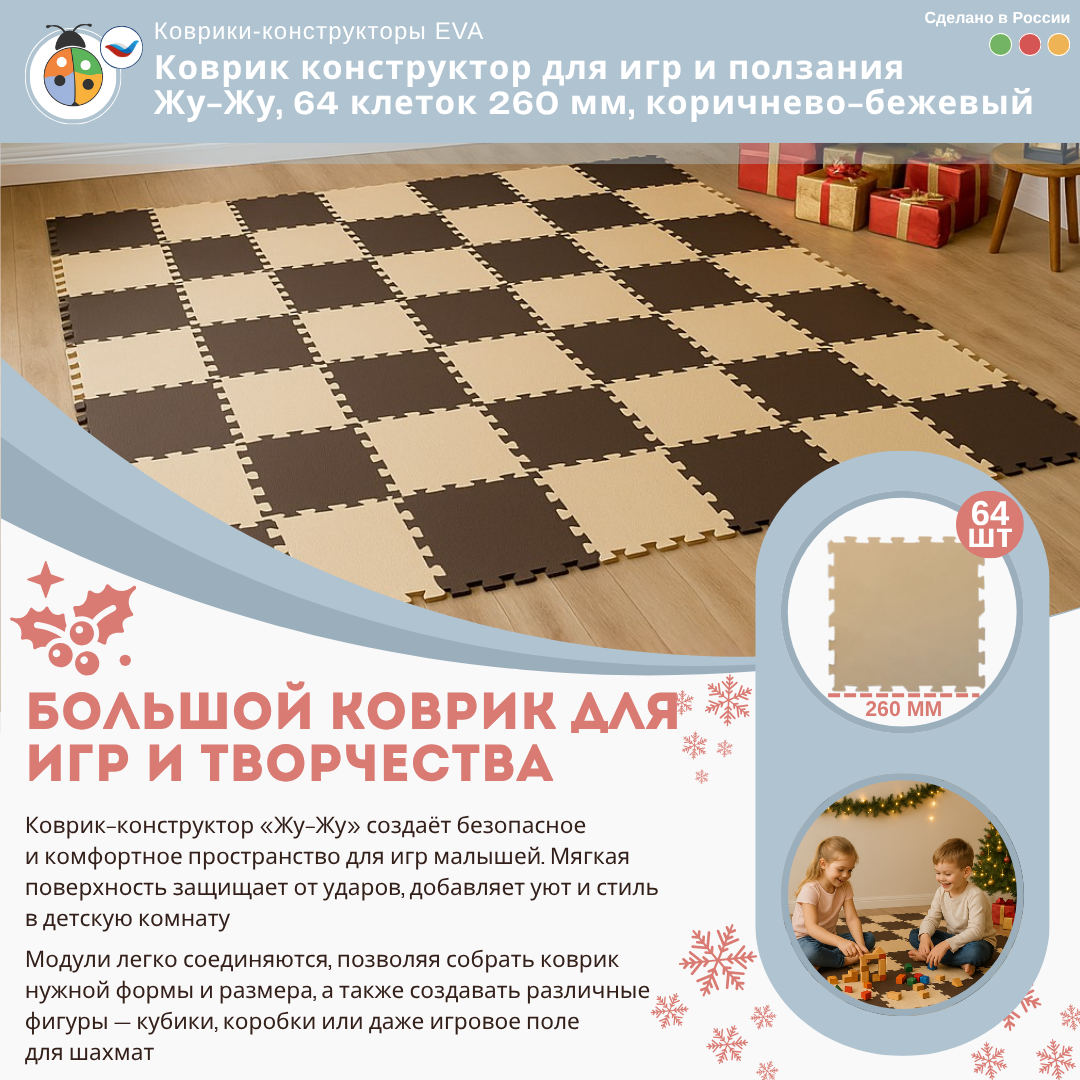Коврик конструктор для игр и ползания Жу-Жу, 64 клеток 260 мм, коричнево-бежевый — это отличный выбор для создания безопасной и комфортной игровой зоны для малышей. Такой коврик обеспечивает мягкую поверхность для игр и ползания, а также добавляет стильный акцент в интерьер детской комнаты.