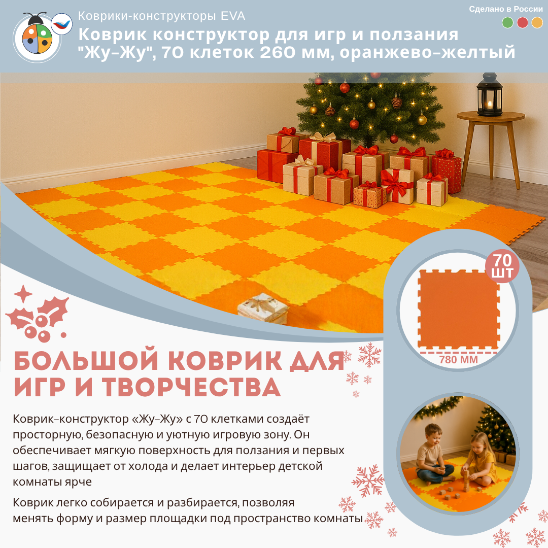 Коврик конструктор для игр и ползания "Жу-Жу", 70 клеток 260 мм, оранжево-желтый — это отличный выбор для создания безопасной и комфортной игровой зоны для малышей. Такой коврик обеспечивает мягкую поверхность для игр и ползания, а также добавляет стильный акцент в интерьер детской комнаты.