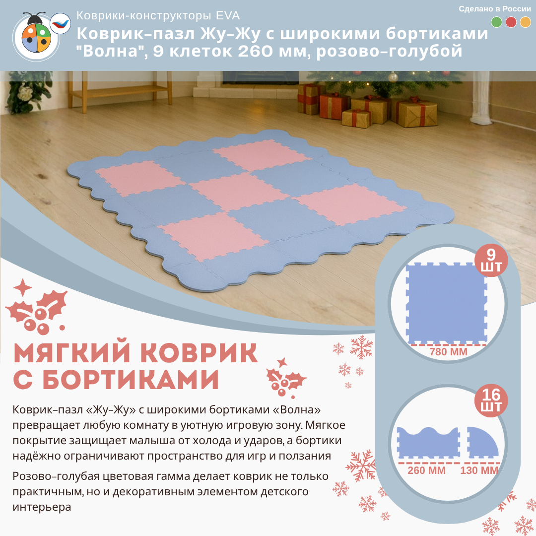 Коврик-пазл Жу-Жу с широкими бортиками "Волна", 9 клеток 260 мм, розово-голубой — это отличный выбор для создания безопасной и комфортной игровой зоны для малышей. Такой коврик обеспечивает мягкую поверхность для игр и ползания, а также добавляет стильный акцент в интерьер детской комнаты.