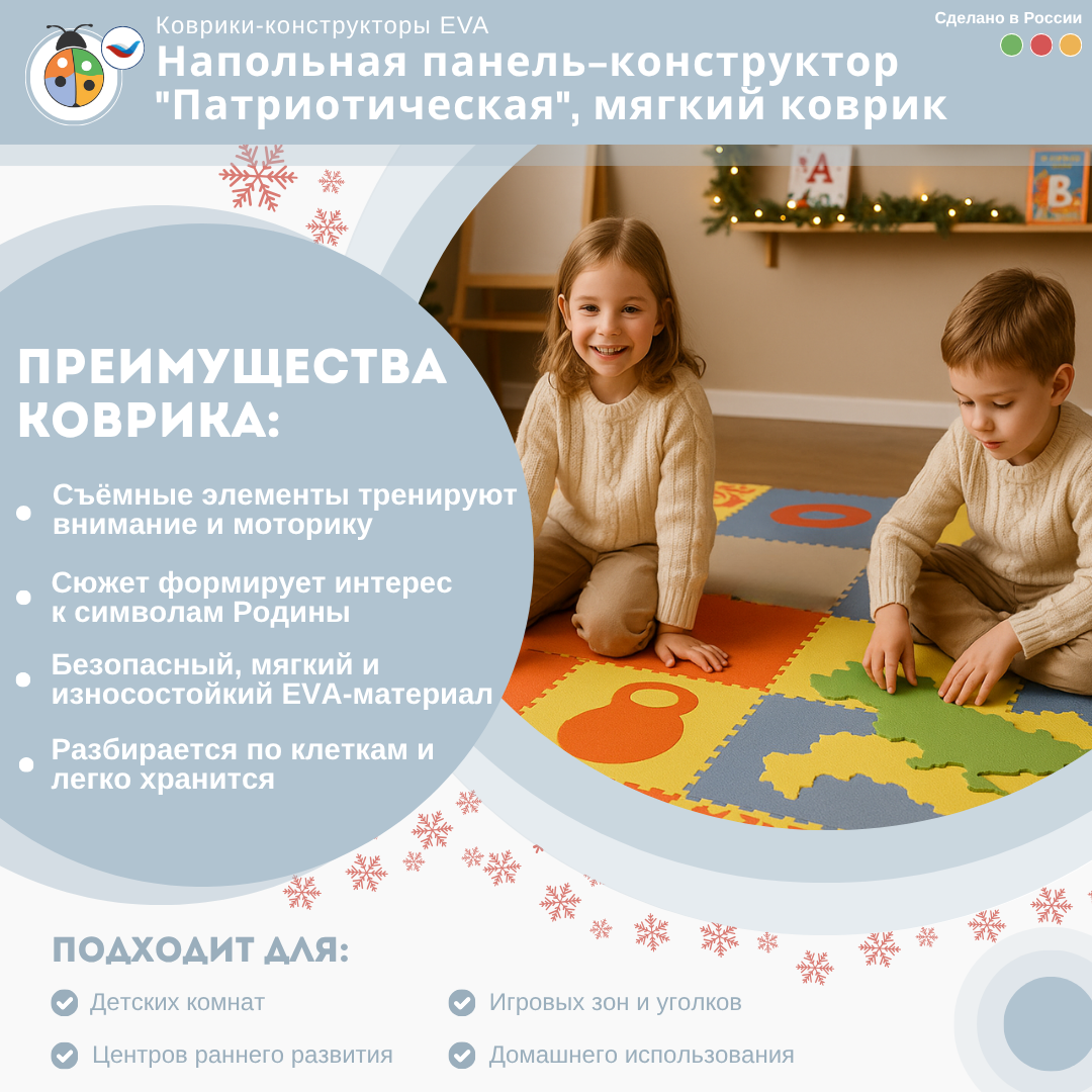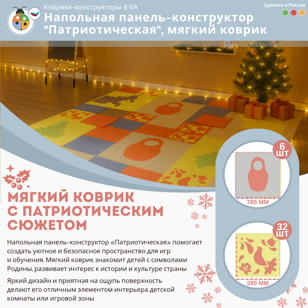 Напольная панель-конструктор "Патриотическая", мягкий коврик — это отличный выбор для создания безопасной и комфортной игровой зоны для малышей. Такой коврик обеспечивает мягкую поверхность для игр и ползания, а также добавляет стильный акцент в интерьер детской комнаты.