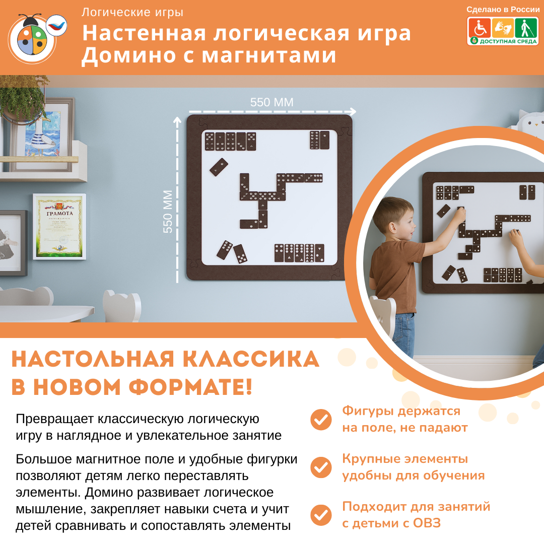 Настенная логическая игра "Домино" с магнитами предназначена для детей дошкольного и школьного возраста.