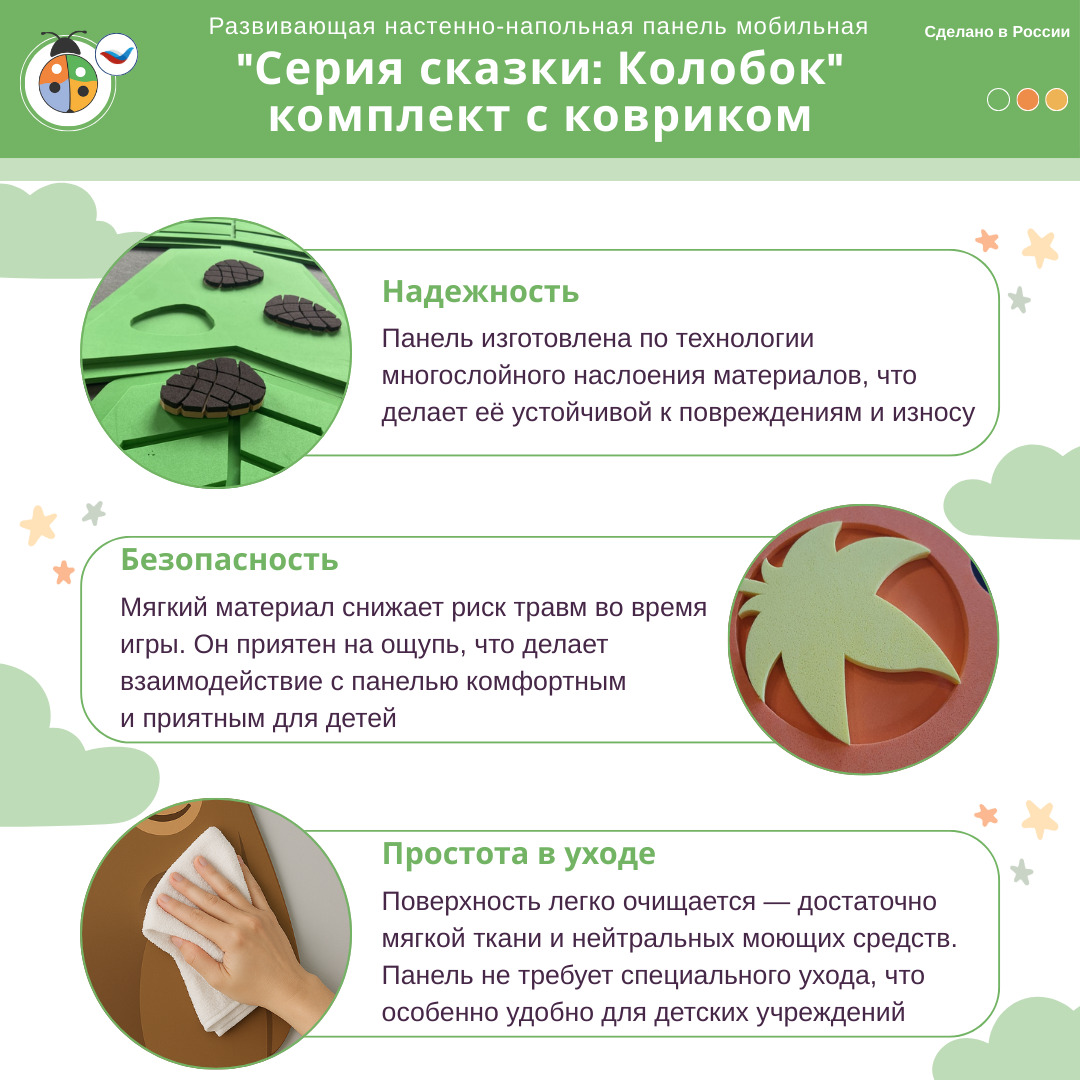 Приобретая развивающую настенно-напольную панель мобильную "Серия сказки: Колобок", комплект (ЖУ-ЖУ-НП9900), вы получаете: