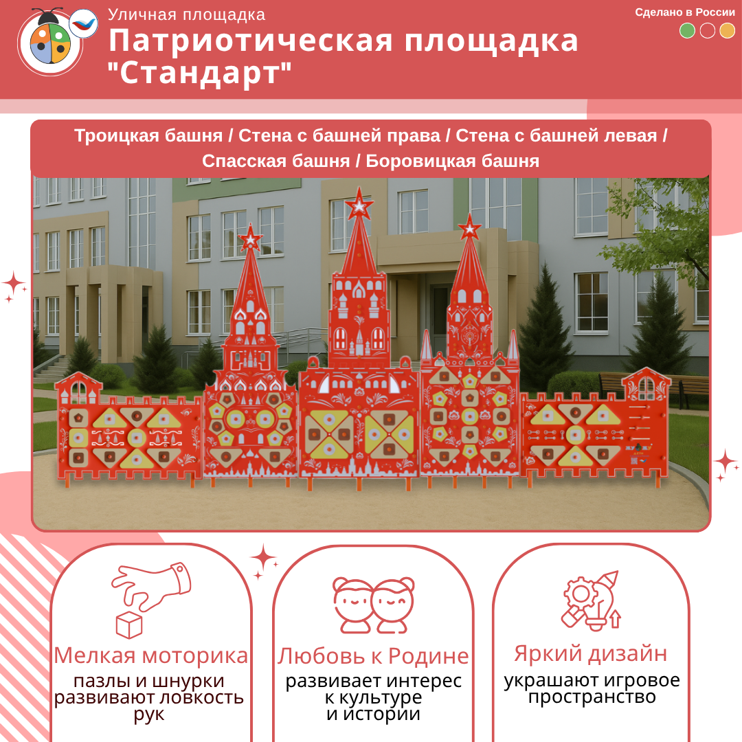 6. Элемент патриотической площадки "Жу-Жу" - Спасская башня, Кремль - делает патриотическую площадку ещё привлекательнее! На стене расположены съемные элементы, которые нужно сопоставить с фигурами, чтобы верно установить элемент, а также шнур.